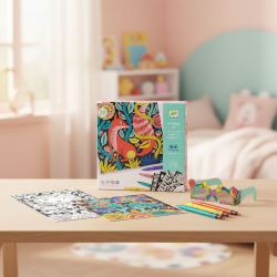 3D výtvarný set Fantastický les je originálna kreatívna sada, v ktorej deti vyfarbujú tajomné lesné ilustrácie tak, aby po nasadení 3D okuliarov získali úžasnú hĺbku.Tajomstvo je v práci s farbami: správna kombinácia teplých a studených odtieňov vytvorí optický efekt, vďaka ktorému sa niektoré časti obrázka posunú do popredia a iné zostanú v pozadí.Sada obsahuje obojstranné fixky s jemným hrotom na detaily a štetcovým hrotom na plynulé vyfarbovanie.Rýchly prehľad odporúčaný vek: od 7 rokov rozvíja: jemnú motoriku, trpezlivosť, cit pre farby, sústredenie v balení: 4 vyfarbovacie karty 20 × 20 cm, 7 obojstranných fixiek (jemný + štetcový hrot), 3D okuliare, farebný návod. Prečo si ju deti zamilujú okamžitý „wow“ efekt – po nasadení okuliarov obrázok naozaj pôsobí priestorovo fixky so štetcovým hrotom robia vyfarbovanie hladké a príjemné deti sa prirodzene učia rozdiel medzi teplými a studenými farbami hotové obrázky vyzerajú skvelo ako dekorácia. Ako to funguje? Vyber kartu a priprav si fixky podľa farebného návodu. Vyfarbuj plochy štetcovým hrotom, detaily doplň jemným hrotom. Dodrž odporúčanú kombináciu teplých a studených farieb, aby vznikol 3D efekt. Nasaď 3D okuliare a pozri sa, ako obrázok vystúpi do priestoru.Obsah balenia 4× vyfarbovacia karta (20 × 20 cm) 7× obojstranná fixka (jemný hrot + štetcový hrot) 1× 3D okuliare 1× farebný návod. Technické parametre materiál: papier / kartón, fixky počet obrázkov: 4 rozmer obrázkov: 20 × 20 cm rozmery balenia: cca 23,5 × 23 × 4 cm odporúčaný vek: 7+
