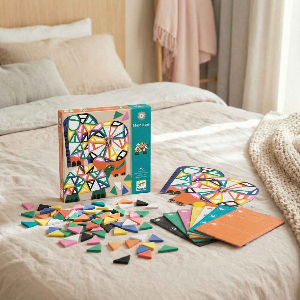 Afrika Odnímateľné mozaikové samolepky Ozdob si zvieratká zo savany Vydaj sa na tvorivú cestu do africkej divočiny! Sada Afrika umožní deťom premeniť tri zvieratká zo savany na farebné mozaikové umelecké dielka. Hrubé, farebné a opakovane použiteľné samolepky skvele padnú do detských rúk a vďaka rôznym tvarom a farebným okrajom je ich nalepovanie prirodzené, jednoduché a veľmi zábavné. Každé zvieratko má svoj vlastný piktogram, ktorý deťom uľahčuje výber správnej nálepky, a ilustrovaný návod krok za krokom im dáva slobodu tvoriť úplne samostatne. Táto kreatívna sada podporuje jemnú motoriku, trpezlivosť aj predstavivosť a zároveň v deťoch prebúdza lásku k prírode. To všetko v krásnom, ekologickom balení s FSC® certifikátom.
