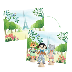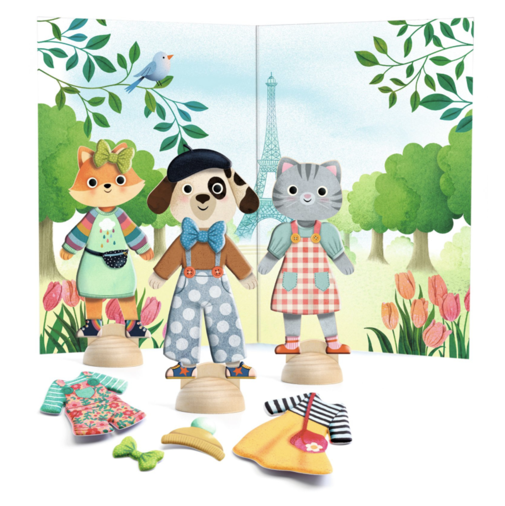 Opakovane použiteľná kolážová aktivita: oblečte 3 rozkošné drevené postavičky so stojanom s viac ako 45 kusmi oblečenia, ktoré sa dajú prilepiť a pripevniť, ako sa vám páči! Všetko, čo zostáva, je vymyslieť niekoľko krásnych príbehov, ktoré sa hodia k 3 návrhom. Papier a lepenka použitá na výrobu má ekologický certifikát FSC®.