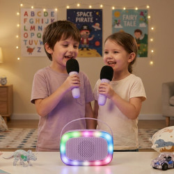 Fialový karaoke set od Lalarma je perfektný pre každé dieťa, ktoré miluje hudbu. S Bluetooth pripojením ho môžete ľahko spojiť so svojím smartfónom alebo tabletom a púšťať si hudbu priamo z obľúbeného zariadenia alebo si svoje obľúbené pesničky môžete nahrať na TF/SD kartu. Vďaka 2 mikrofónom a žiarivým LED svetlám, s 5 svetelnými režimami, bude tento karaoke set hlavnou hviezdou každej párty. Reproduktor ponúka štyri zábavné hlasové efekty, ktoré zaisťujú nekonečnú zábavu pre vaše malé talenty.