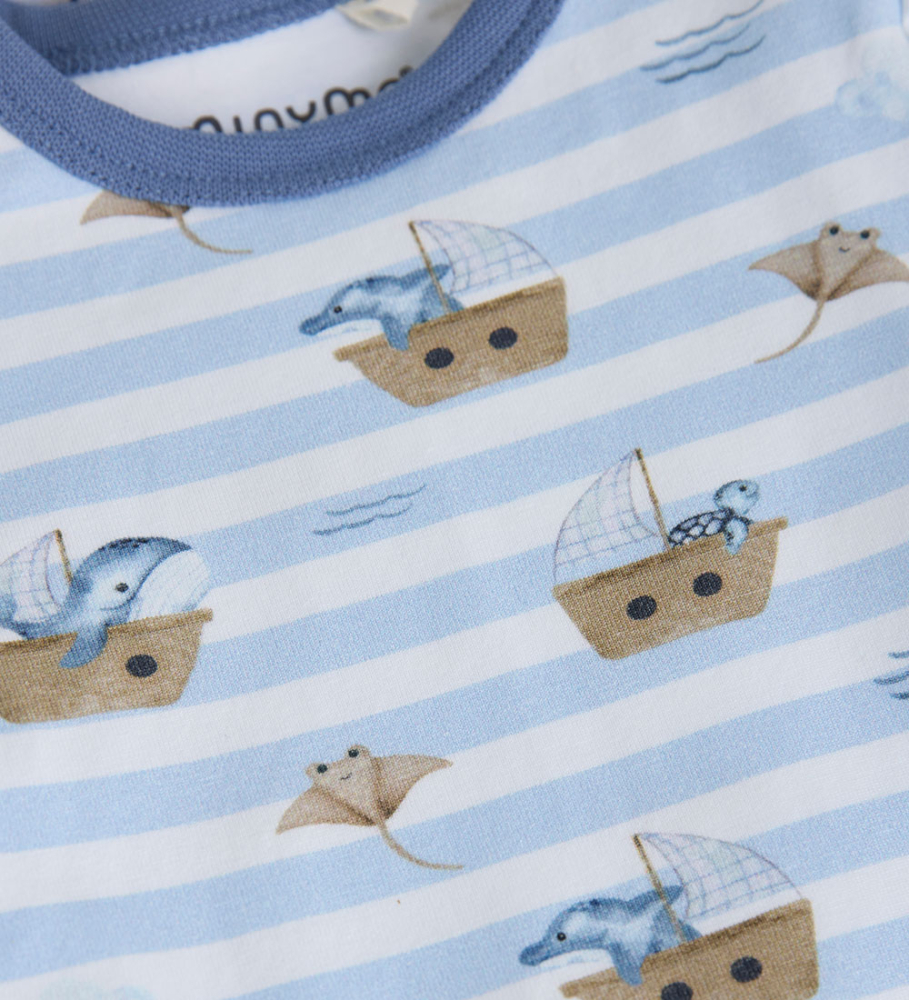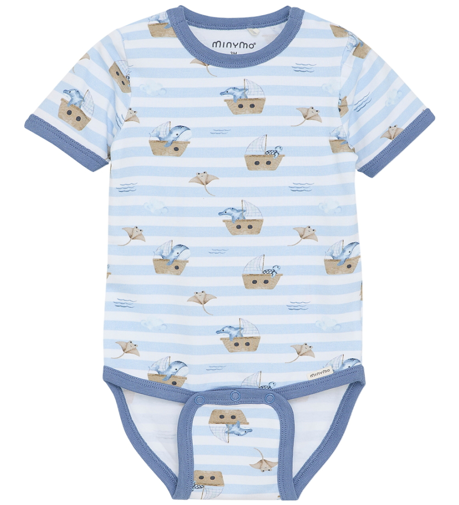Krásne body Minymo s očarujúcim dizajnom pozostávajúcim zo svetlomodrých a bielych pruhov a drobnej potlače lodičiek a morských živočíchov. Body má krátke rukávy s kontrastnými okrajmi v modrom odtieni.