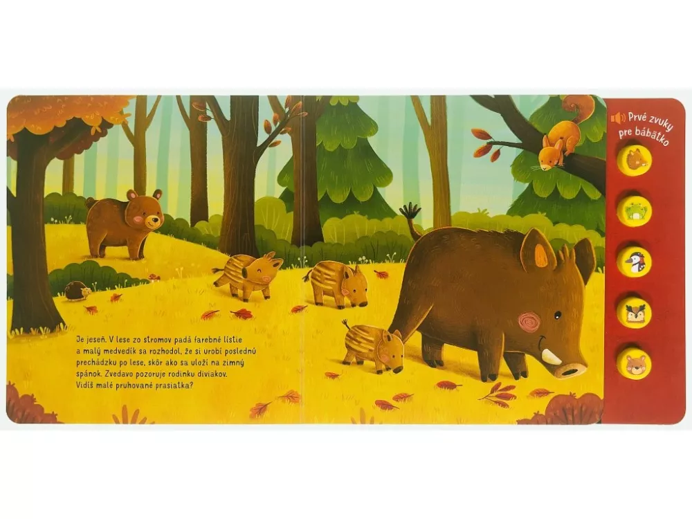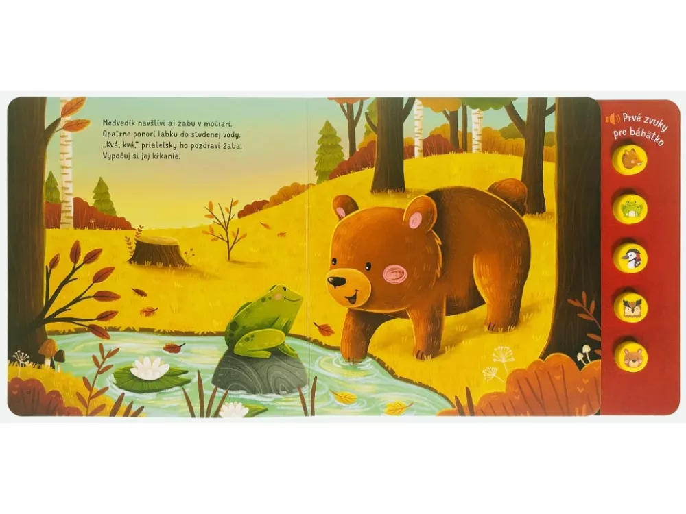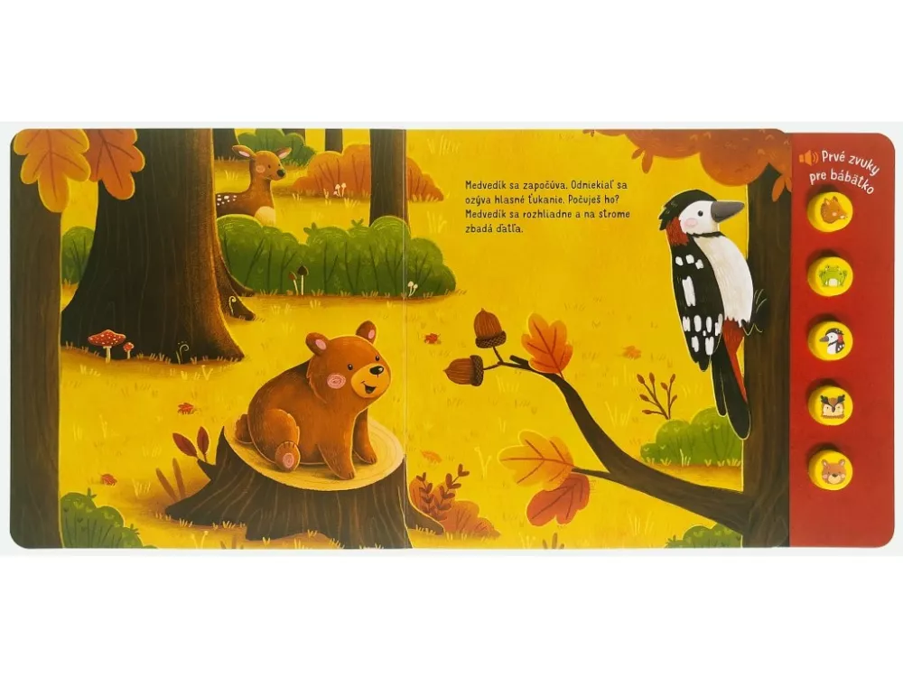 Stlač gumové tlačidlo a vypočuj si zvuky lesných zvierat v tejto prvej zvukovej knihe pre najmenších.Knihou ťa prevedie malý medvedík.