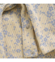 Salopette s volánom uprostred a drevenými gombíkmi s kvetinovým motívom