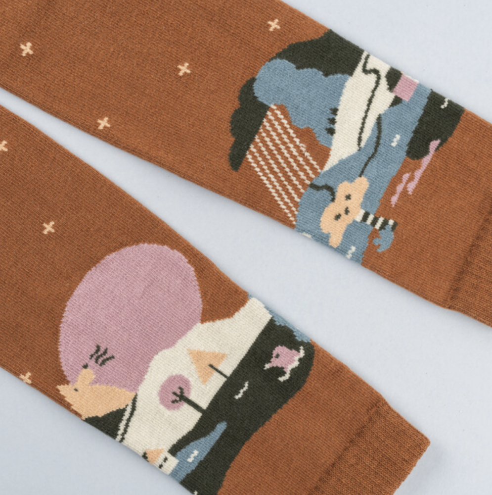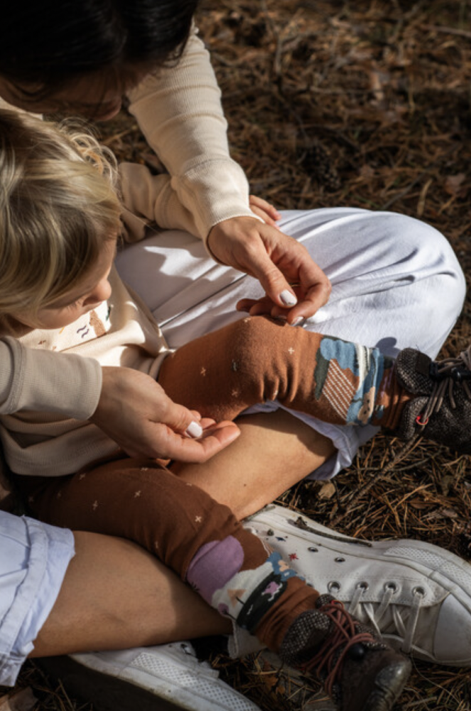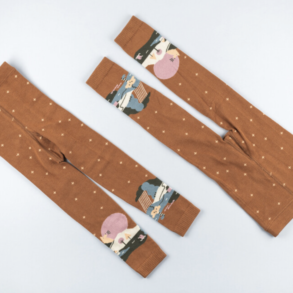 Toto všetko sa nám podarilo vložiť do hnedých balvnených legín s názvom Severské pobrežie. Jedinečné panorámy krajiny v spodnej časti a veselé hviezdičky až po vrch legín vytvorili jedinečný dizajn tohto kúsku. Legíny pre všetky deti, ktoré radi objavujú svet známy aj nepoznaný.