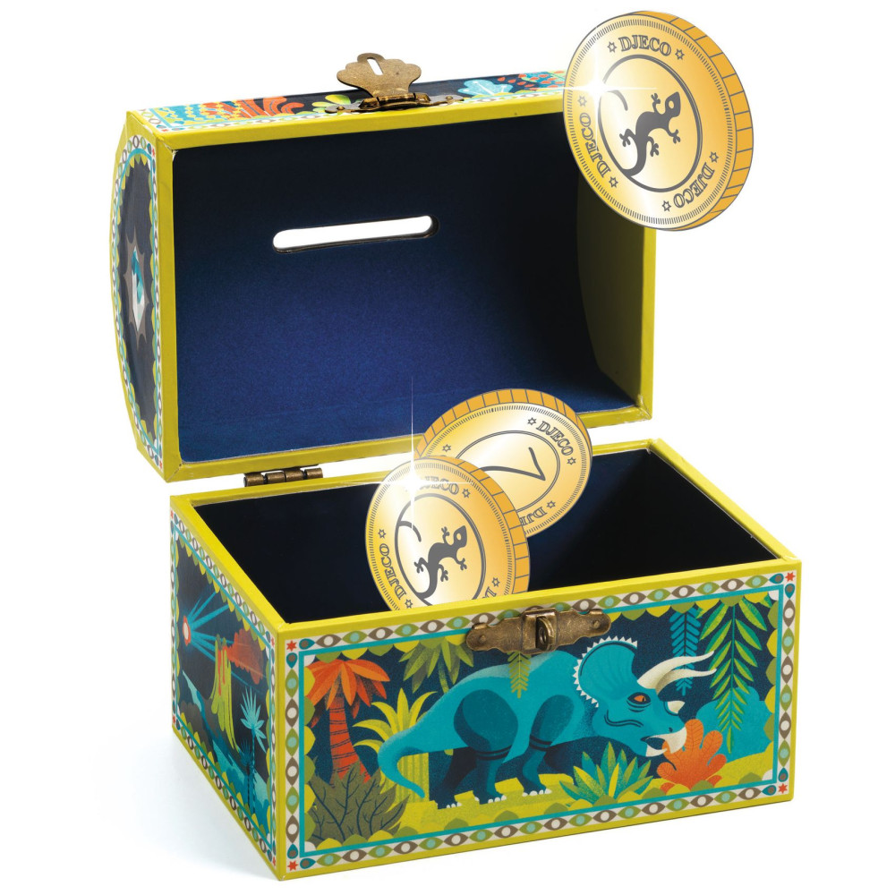Dinosaurus – drevená pokladnička je štýlová a zároveň praktická pokladnička, ktorá deti motivuje šetriť si svoje drobné mince a poklady.Prečo ju vybrať pokladničku od Djeco-pevná drevená konštrukcia pre dlhú trvácnosť, motív dinosaurov pre milovníkov prehistórie, ideálna ako praktický darček alebo dekorácia izby. Obsah balenia1 drevená pokladnička s motívom dinosaurov, 2 kľúčiky