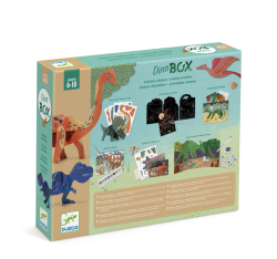 Obsah: 4x hárok s časťami na poskladanie kartónových dinosaurov, 1x trojdielny roztvárací obraz, 13x pečiatky, 1x poduška na pečiatky, 1x pero, 4x vyškrabovacie obrázky, 1x drevená škrabka, 2x obrázok na koláž, 2x hárok s prvkami na koláž, 1x obrázok na dofarbenie vodovkami, 1x vodové farby, 1x štetec, 1x obrázok na dotvorenie farebnými fóliami, 4x hárok farebných fólií, 1x hárok s obojstranne lepiacimi lepkami, 2x hárok s obojstranne lepiacimi štvorčekmi.
