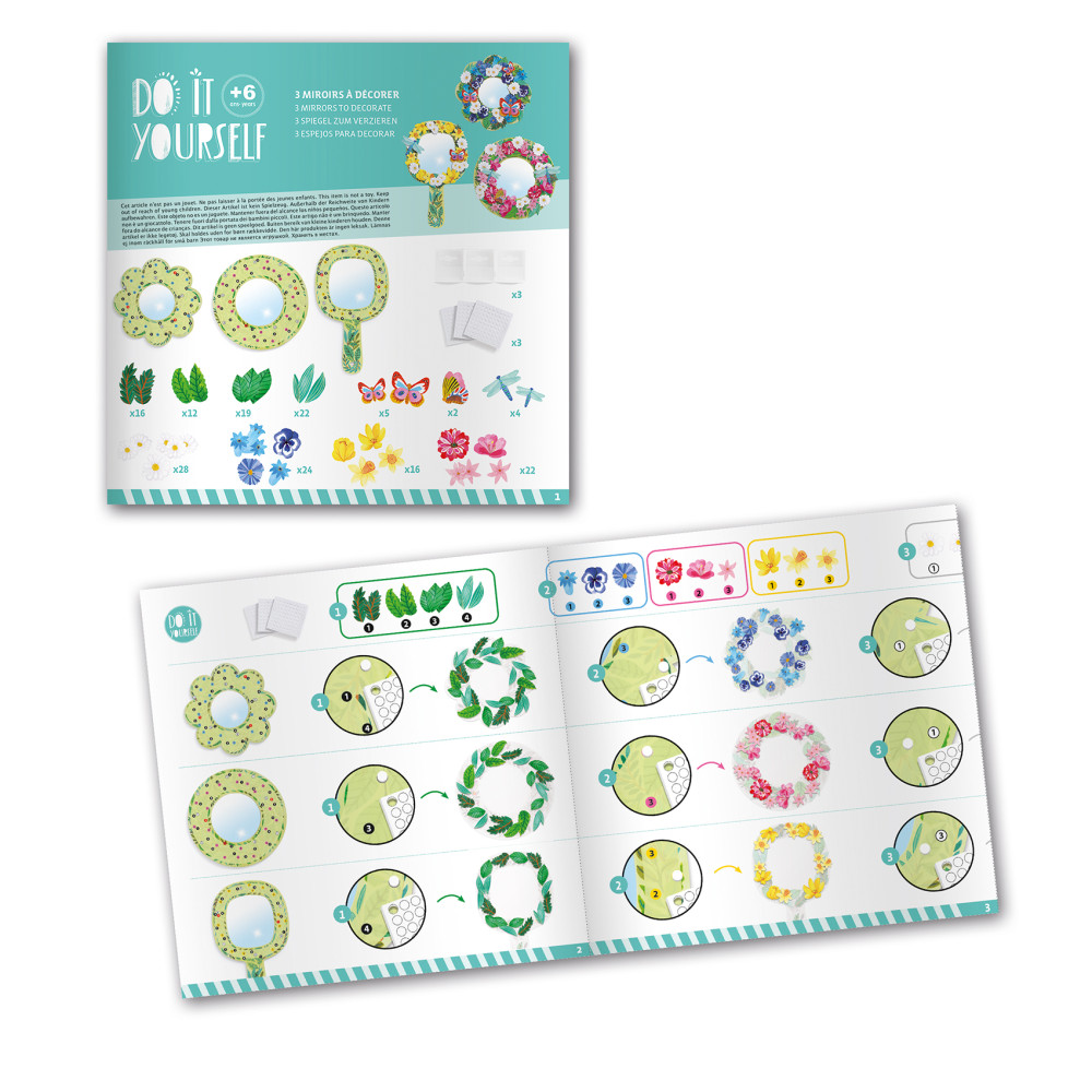 DIY Kreatívna sada Kvetinové zrkadlá je jemná tvorivá aktivita, ktorá sa mení na krásnu dekoráciu. Deti dozdobia 3 zrkadlá množstvom predvystrihnutých kvetov a listov a nalepia ich pomocou hrubších penových samolepiek, vďaka čomu vznikne 3D efekt. Na záver sa zrkadlá dajú jednoducho zavesiť vďaka priloženým závesným nálepkám.Rýchly prehľad odporúčaný vek: od 6 rokov rozvíja: jemnú motoriku, estetické cítenie, trpezlivosť výsledok: 3 ozdobené zrkadlá do detskej izby. Ako sa s tým tvorí? Vyber si zrkadlo a rozlož si kvety podľa vlastného dizajnu. Prilep kvety pomocou penových samolepiek pre 3D efekt. Pridaj závesnú nálepku a zrkadlo zaves.Obsah balenia 3× zrkadlo (akryl) v 3 tvaroch/veľkostiach 170× predvystrihnutá papierová dekorácia (kvety/listy) 3× sada hrubších obojstranných penových samolepiek 3× závesná nálepka na zavesenie 1× návod. Technické parametre vek: od 6 rokov materiál: akryl, papier/kartón, penové samolepky