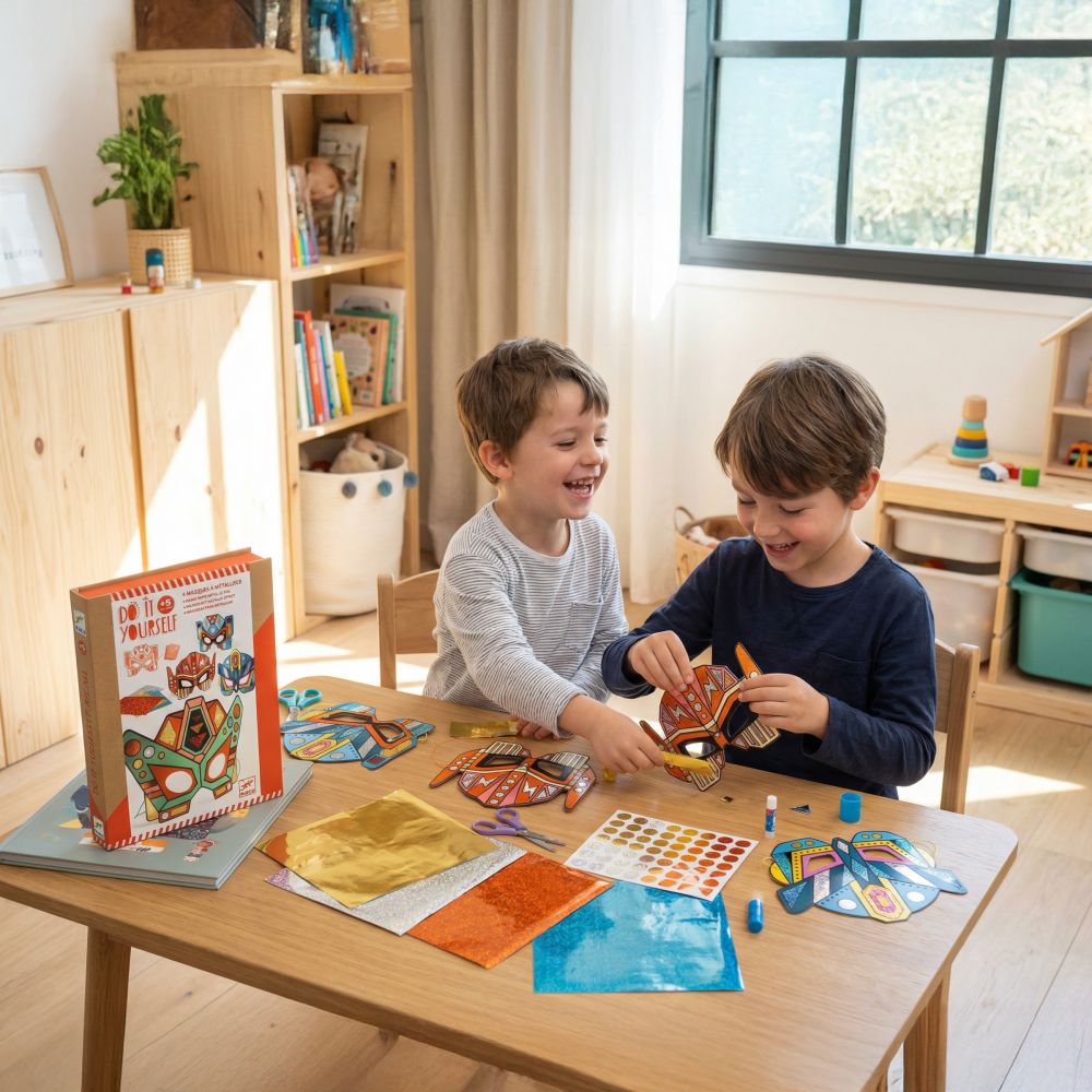 Kreatívna sada štyroch masiek super robotov na ozdobenie farebnými fóliami s metalickým leskom. Na ilustrovaných maskách sú lepivé plôšky, vďaka čomu je aktivita čistá, bez potreby použiť lepidlo. Dieťa pritlačí hárok fólie určitej farby na lepivú plôšku, hárok stiahne a plôška zostane polepená metalicky lesklou fóliou. Takto vyplní všetky plôšky.Deti si precvičia jemnú motoriku a koncentráciu. Pre každú masku je pribalená elastická šnúrka, ktorú pristrihnete podľa obvodu hlavy a uviažete na masku. Sada je výborná na spoločné tvorenie a hru viacerých detí. Sada je vyrobená z papiera a lepenky s ekologickým certifikátom FSC®. Kolekcia DIY (Vytvor si sám) má blízko k úžitkovému umeniu a umožňuje deťom zhotoviť umelecké výrobky, ktoré si môžu nielen hrdo vystaviť, ale ich aj používať. Obsah: 4 masky s lepivými plôškami, 30 hárkov farebných fólií s metalickým leskom, 4 farebné elastické šnúrky (gumičky), 1 obrázkový návod. Rozmery masiek: 22 x 16 cm.