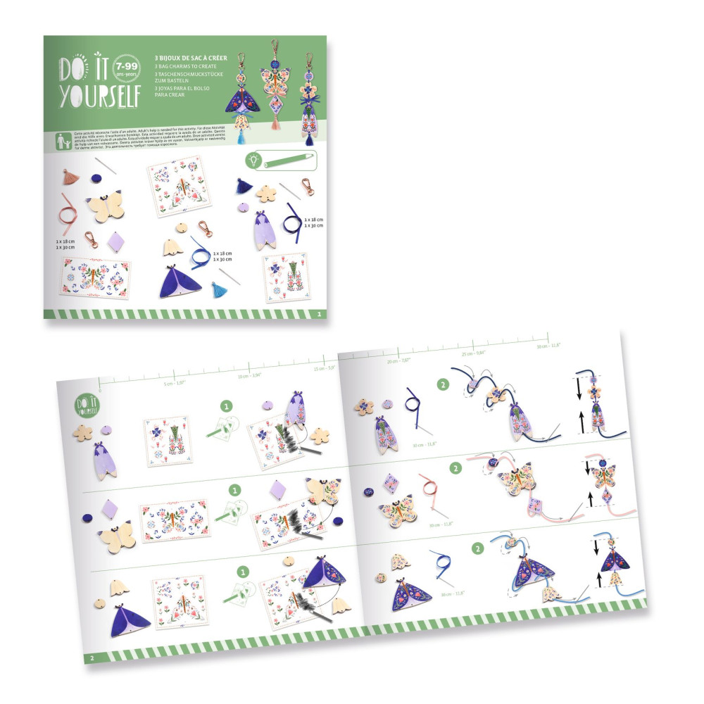 S kreatívnou sadou DIY Motýlie prívesky na tašku od značky Djeco si deti vytvoria až 3 jedinečné prívesky, ktoré môžu nosiť na školskej taške či ako malé osobné talizmany a kľúčenky. Každý prívesok má svoj vlastný dizajn a postup tvorenia, vďaka čomu vznikajú tri úplne odlišné, farebné a efektné motýlie doplnky. Sada je navrhnutá tak, aby deti postupovali podľa obrázkového návodu, no zároveň mali priestor pre vlastnú fantáziu – volia farby, kombinujú vrstvy, lepidlá a dekorácie tak, aby výsledný prívesok bol presne podľa ich štýlu. Výsledkom sú pevné a krásne lesklé prívesky, ktoré deti môžu nosiť každý deň. Každý prívesok sa upevňuje na kovovú karabínku, aby sa dal ihneď pripnúť na tašku či batoh.Čo deti rozvíjajú pri tvorení:jemnú motoriku (lepenie, vrstvenie dielikov), trpezlivosť a zameranie na detail, vizuálne vnímanie farieb a kompozície, kreativitu a vlastný štýl. Prečo si vybrať kreatívnu sadu Motýlie prívesky od Djeco:deti si vytvoria 3 reálne použiteľné doplnky, ideálny darček pre deti od 7 rokov, výborné na tvorivé popoludnie, oslavy či spoločné tvorenie, kvalitné materiály a ilustrácie typické pre Djeco, jasný obrázkový návod, motivuje k estetickému cíteniu a samostatnej tvorbe. Obsah balenia:9 základných drevených dielikov motýľov, 3 hárky ilustrovaných dielov na vrstvenie, 3 kovové krúžky / karabínky na upevnenie, 6 stužiek, ihla, 3 strapce, obrázkový návod krok za krokom