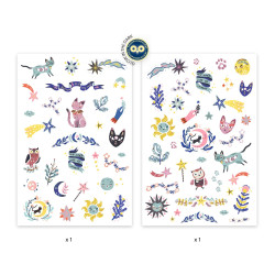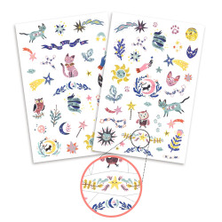 Dočasné tetovačky Sladké sny potešia všetkých malých milovníkov nočnej oblohy a snových motívov. Vybrané časti tetovačiek svietia v tme – stačí ich „nabiť“ svetlom. Motívy sú predseknuté, aplikujú sa jednoducho pomocou vody a sú dermatologicky testované.Rýchly prehľad odporúčaný vek: od 3 rokov čo deti získajú: 2 hárky svietiacich tetovačiek + návod efekt: glow-in-the-dark (svieti po nasvietení). Ako sa používajú? Vystrihni motív a odstráň ochrannú fóliu. Prilož na kožu (obrázkom nadol) a navlhči. Po pár sekundách papier zlož. Pred „nočnou show“ tetovačku na chvíľu nasvieť.Obsah balenia 2× hárok svietiacich dočasných tetovačiek 1× návod. Technické parametre vek: od 3 rokov typ: dočasné tetovačky (aplikácia vodou) bezpečnosť: dermatologicky testované