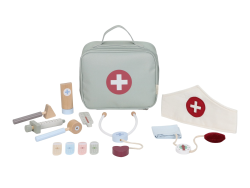 Pani doktorka, pán doktor – mohli by ste sa na mňa pozrieť? S touto krásnou drevenou doktorandskou sadou bude vaše dieťa pripravené postarať sa o každého pacienta. Textilná lekárska taška ukrýva všetko základné vybavenie: teplomer, injekciu, obväzy, stetoskop, tlakomer a dokonca aj doktorskú čiapku.