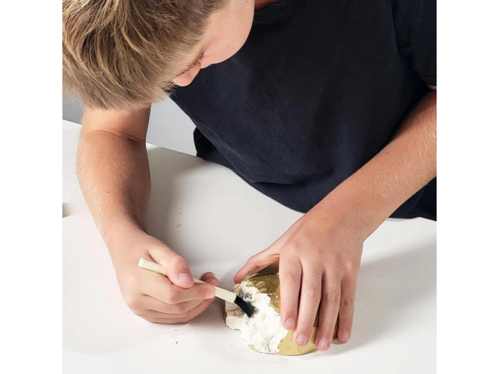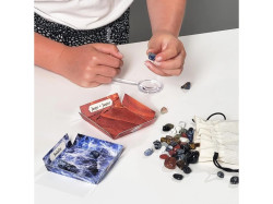 Vykopávanie kameňov: V balení sa nachádza blok sadry so skrytými surovými kameňmi, ktoré si deti môžu vyťažiť pomocou kladivka a dlátka.