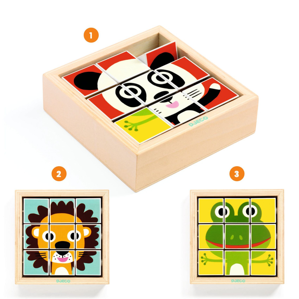 Drevené kocky Tournanimo sú hravé pretáčacie puzzle pre malé deti, ktoré milujú okamžitý výsledok.Na 3 tyčkách sú navlečené otáčacie dieliky – dieťa ich jednoducho pretáča a skladá tak obrázky zvieratiek.Veľké plus pre rodičov: dieliky zostávajú pevne v ráme, takže sa pri hre nestrácajú. Rýchly prehľad odporúčaný vek: od 2 rokov typ hry: pretáčacie puzzle v drevenom ráme počet tyčiek: 3 výhoda na cestovanie: dieliky sú stále v ráme materiál: drevo (FSC), plastové dieliky, kovové tyčky Prečo si ho deti zamilujú stačí pretáčať a hneď vidia zmenu obrázka trénuje jemnú motoriku a koordináciu oko–ruka podporuje postreh a skladanie podľa tvarov a detailov učí rozpoznávať zvieratká a pomenúvať ich časti odolné spracovanie – vhodné na každodenné hranieObsah balenia 1× drevený rám 3× kovová tyčka 9× otáčací dielik (navlečený v ráme)Technické parametre odporúčaný vek: 2+ materiál: drevo (FSC), plast, kov rozmery hračky: približne 13 × 13 cm rozmery balenia: približne 13 × 13 × 4 cm