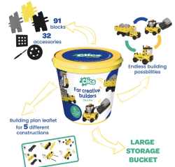 Ekologická stavebnica pre deti Clics Stavba 123 ks belgickej značky Clics Toys v praktickom vedierku umožní deťom postaviť si celé stavenisko so stavebnými strojmi. Box Stavba obsahuje 91 stavebných blokov a ďalších 32 stavebných kompozitov a nálepiek na vytvorenie až 5 realistických figúrok, s ktorými sa potom deti môžu hrať. Vďaka patentovanému zaklikávaciemu a otáčaciemu systému zloženého zo špeciálnych blokov 5 x 5 cm sú spolu jednotlivé dieliky kompatibilné. Deti tak môžu vytvárať stavby podľa návodu aj podľa svojej fantázie.