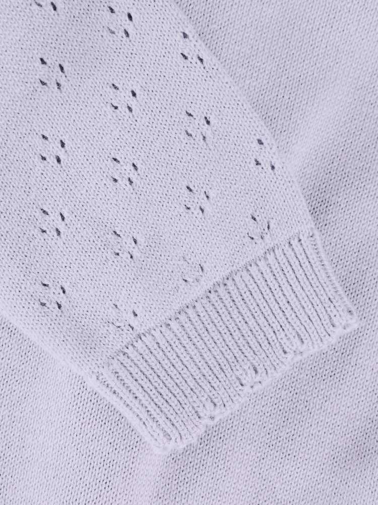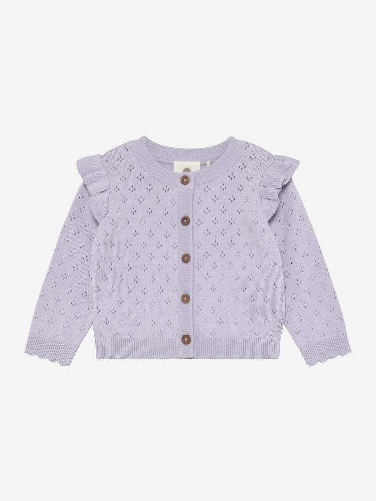 Kardigán má dlhé rukávy s volánom na ramenách a vpredu sa zapína na gombíky. Je pletený v pointelle vzore. Certifikované podľa GOTS – organic (CERES-0366).