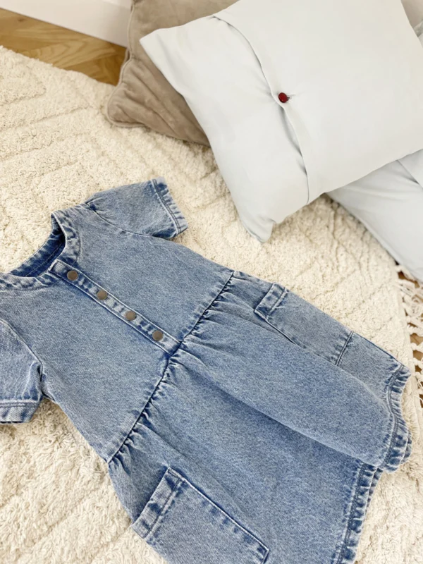 Krásne jednofarebné džínsové šaty od EN FANT. Šaty majú krátke rukávy a predné vrecká. Šaty sa zapínajú vpredu na gombíky. Certifikované podľa ŠTANDARDU 100 spoločnosťou OEKO-TEX®, certifikačné číslo 2276-364 DTI.