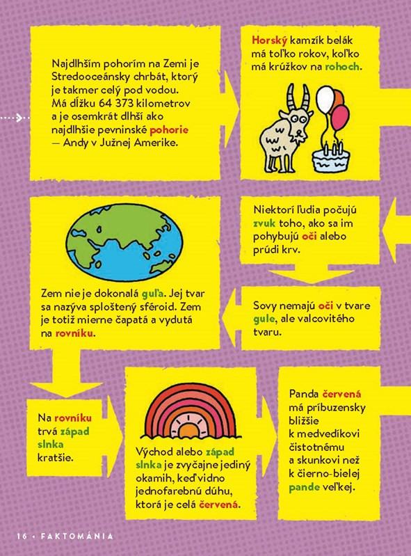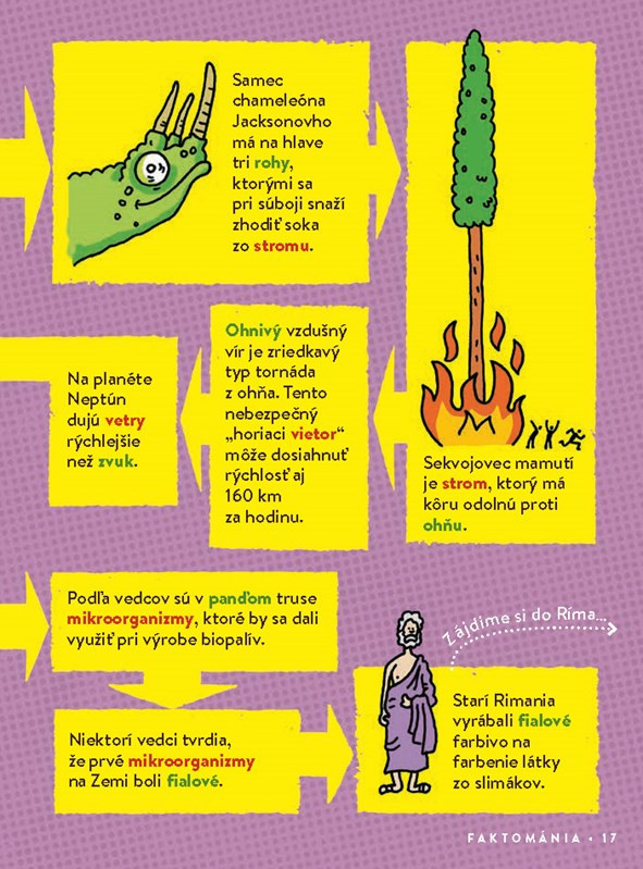 FAKTopia Zábavná náučná kniha plná fantastických faktov: objavuj nečakané súvislosti od dinosaurov až po vesmírTRAMTARARÁ! Víta ťa skvelá FAKTopia - krajina fantastických faktov!Na každý fakt v tejto knihe prekvapujúco nadväzuje ďalší fakt. Vydaj sa po ceste plnej zaujímavostí, ktorá sa stáča od dinosaurov k sliepkam, potom odbočí do vesmíru a neskôr sa vráti ku kozám. FAKTopiou nevedie len jediná trasa. Na ceste sú mnohé zábavné odbočky, ktorými môžeš hocikedy preskočiť na úplne iné miesto v knihe. Tak zisti, kam ťa tvoja zvedavosť zavedie!