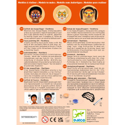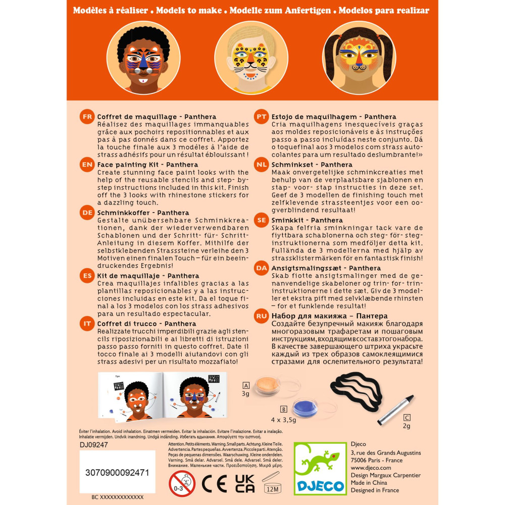 Farby na tvár – Panter sú sada na detské líčenie, ktorá pomôže vytvoriť výraznú premenu aj bez skúseností.Vďaka šablónam na pokožku jednoducho spravíš škvrny, pruhy či detaily, perleťový/metalický prvok dodá lesk a samolepiace perličky a kamienky urobia finálny „wow“ efekt.Rýchly prehľad odporúčaný vek: 4 – 7 rokov 3 hotové predlohy: v návode nájdeš postupy na 3 zvieracie looky jednoduchá aplikácia: hubkou na plochy, štetcom na detaily, šablónou na vzory extra efekt: metalický tieň + perličky a kamienky materiál balenia: papier/kartón s certifikáciou FSC. Obsah balenia 4 farby na tvár 1 metalický tieň na oči 1 ceruzka 1 štetec 2 hubky 1 obojstranný aplikátor/tieňovací štetec 1 hárok šablón na pokožku cca 40 samolepiacich perličiek a kamienkov 1 návod krok za krokom (predlohy na 3 looky). Ako to funguje? Vyber si look z návodu a priprav farby, hubku alebo štetec. Prilož šablónu na pokožku a jemne nanes farbu (hubkou/štetcom). Detaily dokresli ceruzkou a pridaj metalický lesk tieňom. Na záver nalep perličky a kamienky – hotovo, šelma je na svete.Pre koho je na karneval, oslavy, fotenie a rolové hry pre deti, ktoré milujú divoké zvieratá a výrazné masky ako aktivita, ktorú zvládnete rýchlo aj doma