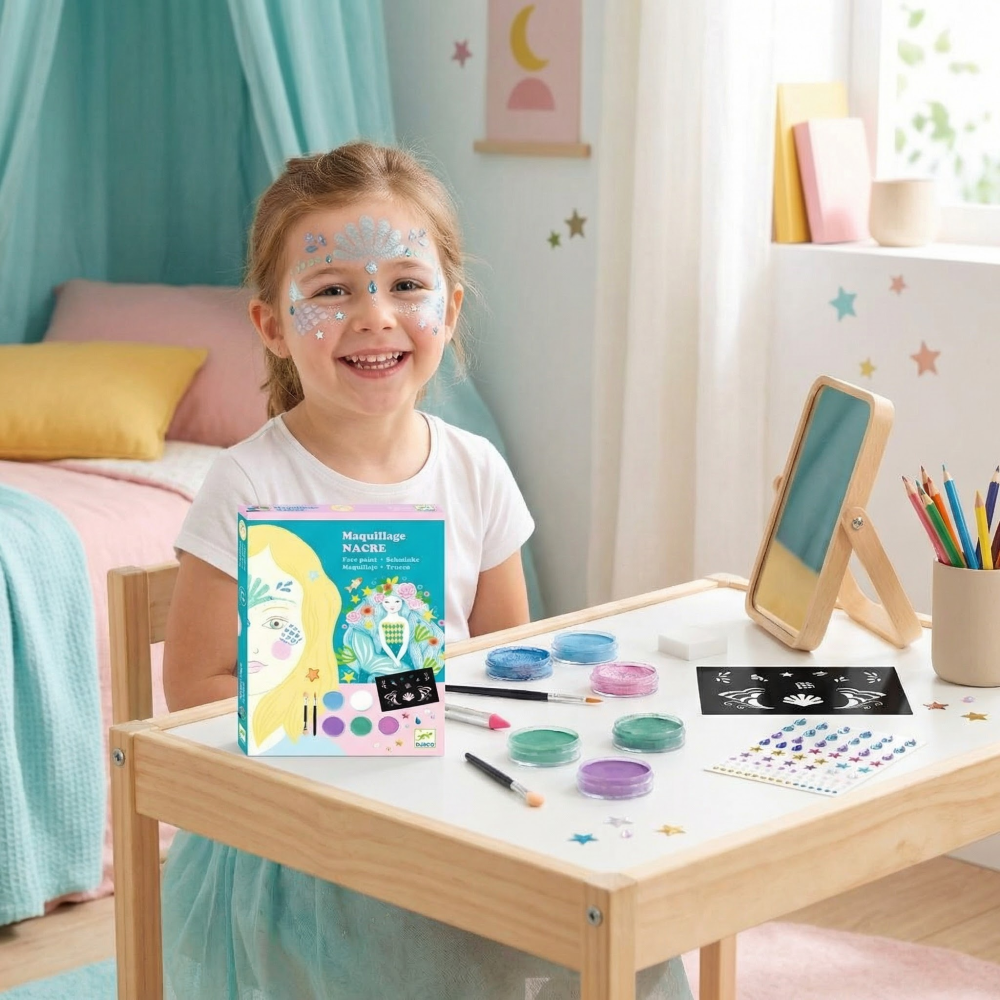 Farby na tvár – Perleťové sú kreatívna sada na maľovanie tváre, s ktorou deti rýchlo vytvoria žiarivé, rozprávkové premeny.V balení nájdeš perleťové farby, šablóny na pokožku a samolepiace perličky a kamienky na dozdobenie – výsledok vyzerá efektné aj bez veľkej zručnosti.Rýchly prehľad odporúčaný vek: od 4 rokov efekt: perleťový/metalický lesk pre žiarivé detaily šablóny: priľnú na pokožku a uľahčia presné tvary dozdobenie: perličky a kamienky praktické: súčasťou je návod s predlohami na viac hotových lookov. Obsah balenia 4 farby na tvár 1 metalický tieň na oči 1 ceruzka 1 štetec 2 hubky 1 obojstranný aplikátor 1 hárok šablón na pokožku cca 40 samolepiacich perličiek a kamienkov 1 návod krok za krokom (predlohy na 3 looky). Ako to funguje? Vyber si look z návodu a priprav farby, hubku alebo štetec. Prilož šablónu na pokožku a jemne nanes farbu (hubkou alebo štetcom). Detaily dokresli ceruzkou a pridaj metalický lesk tieňom. Na záver nalep perličky a kamienky pre trblietavý efekt.Pre koho je na oslavy, karneval, hranie rolí a fotenie pre deti, ktoré milujú víly, morský svet a trblietky pre rodičov, ktorí chcú rýchly efekt aj bez profi skúseností