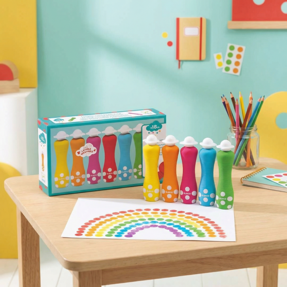 Farby v tube s penovým aplikátorom sú farbiaci nástroj, ktorého hrotom môžu najmenší tlačiť na papier koľko chcú. Práve takto sa týmito farbami maľuje: priložiť na papier, zatlačiť a kuk, zostane farebný punktík. Do túb netreba pridávať vodu.Majú ergonomický dizajn vhodný pre detský úchop. Tuby majú ergonomický dizajn a veľkosťou sú prispôsobené drobným rúčkam. Svieže farby sa budú drobcom páčiť. Pofarbených prstov a oblečenia sa nemusíte báť, pretože farby sú super ľahko vyprateľné. Po farbení na tuby zas nasaďte veľké biele vrchnáky, aby farby nevyschli.Obsah: 6 farieb v tube s penovým aplikátorom.
