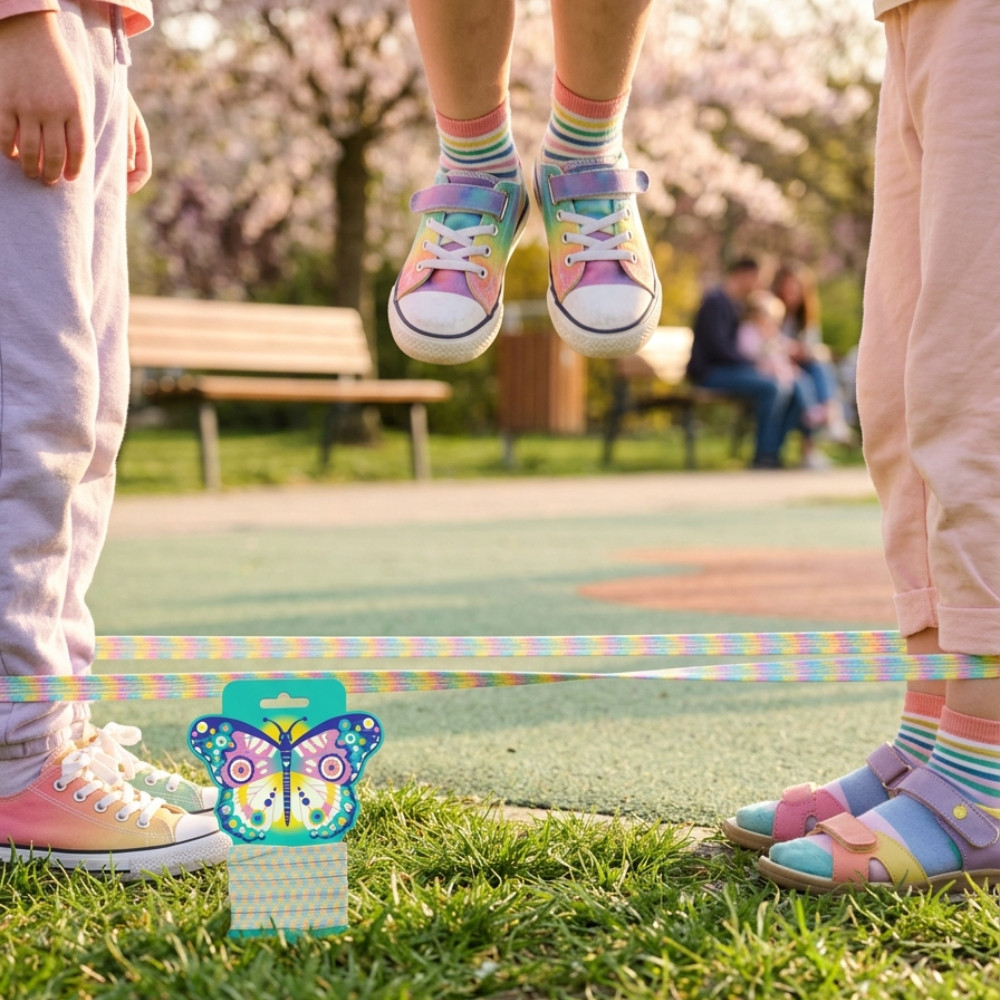 Guma na skákanie Motýľ je originálny produkt značky Djeco, ktorý prináša späť obľúbenú detskú hru z ihrísk. Pružná guma je pripravená ako uzavretá slučka, takže sa počas hry nerozväzuje. Deti skáču cez gumu natiahnutú medzi členkami dvoch hráčov a skúšajú rôzne zostavy a „triky“.Hra, ktorá deti prirodzene rozhýbe podporuje koordináciu, rovnováhu a pocit rytmu trénuje sústredenie a presnosť pohybov výborná na hru vonku aj doma (napríklad medzi dve stoličky) ideálna na spoločnú hru s kamarátmi aj na vlastné výzvy. Veková kategória: vhodné pre deti 6 – 10 rokov. Dĺžka slučky: približne 1,5 m. Šírka gumy: približne 1 cm. Rozmer balenia: približne 13 × 17 × 1 cm
