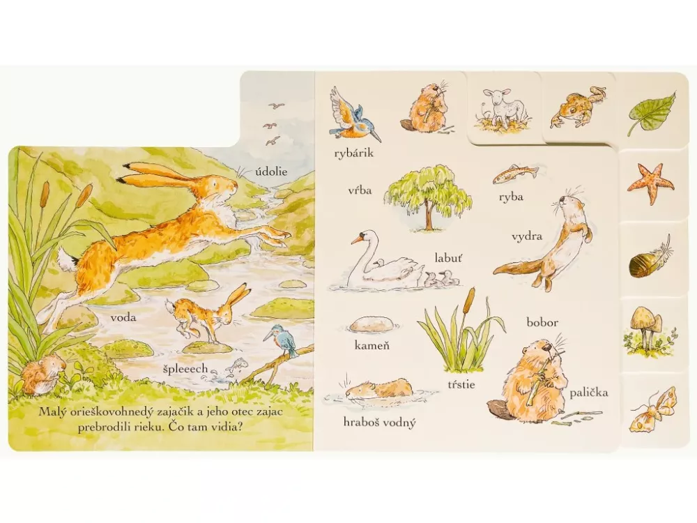 Spoznávajte svet s malým zajačikom a naučte sa 100 nových slov! Leporelo s milými ilustráciami a záložkami je ideálne pre najmenšie deti. Pridajte sa k malému orieškovo hnedému zajačikovi a jeho oteckovi na výpravu okolo sveta. Navštívite rôzne prostredia od rybníka cez hory a od lúky až po nočný les. Spoločne budete spoznávať, čo všetko sa tam nachádza. V tomto leporele zo sveta Hádaj, ako veľmi ťa mám rád! od Sama McBratneyho deti objavia 100 nových slov, ktoré im pomôžu rozvíjať slovnú zásobu hravou formou. Kniha obsahuje pevné záložky na ľahšiu orientáciu, milé texty, popisy pri obrázkoch a krásne ilustrácie Anity Jeram. Pokiaľ sa radi vraciate do sveta orieškovo hnedých zajačikov, toto leporelo na rozvoj slovnej zásoby by nemalo chýbať vo vašej knihovničke.
