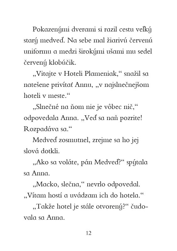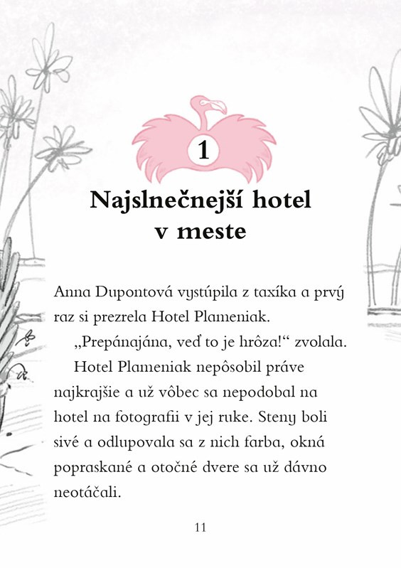 Hotel Plameniak 1 Dobrodružný príbeh o záchrane chátrajúceho hotela, priateľstve a zvieracích hosťochAnna je novou majiteľkou Hotela Plameniak. Kedysi veľkolepý hotel však chátra a dievčatko čaká náročná úloha. S pomocou svojich zamestnancov a priateľov – vrátnika pána Medveďa, recepčného lemura Lemyho či svetoznámej kuchárky Madam La Svinky – chce, aby sa tu každé zviera, malé i veľké, cítilo ako doma.Podarí sa Anne vrátiť hotelu dávny lesk a zašlú slávu?
