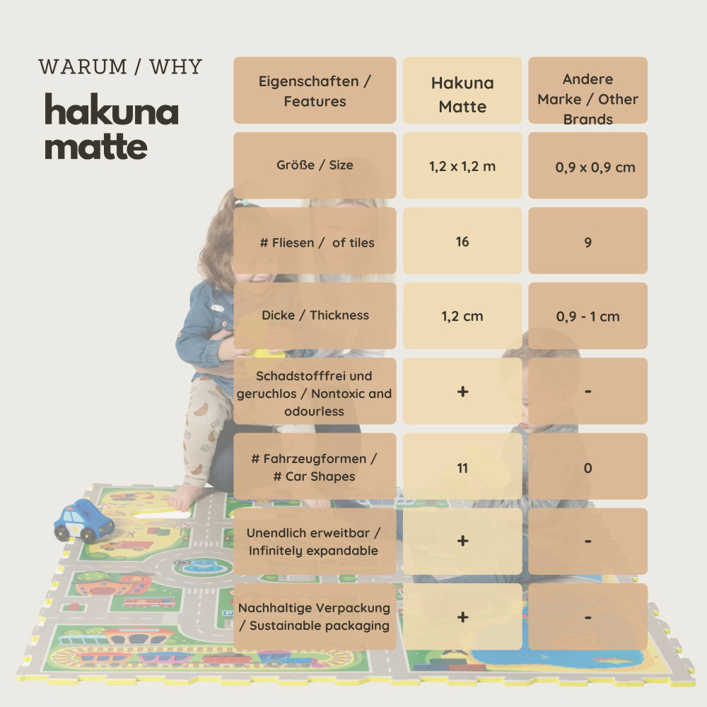 Výnimočnou výhodou tejto puzzle podložky je jej modulárny systém – jednotlivé diely do seba jednoducho zapadnú, a tak môžete bez obmedzení spojiť dve, tri alebo aj viac podložiek a vytvoriť rozsiahle mesto plné ciest, budov a dobrodružstiev. Vďaka tomu rastie podložka spolu s fantáziou vášho dieťaťa – od malej uličky až po celé dopravné impérium.