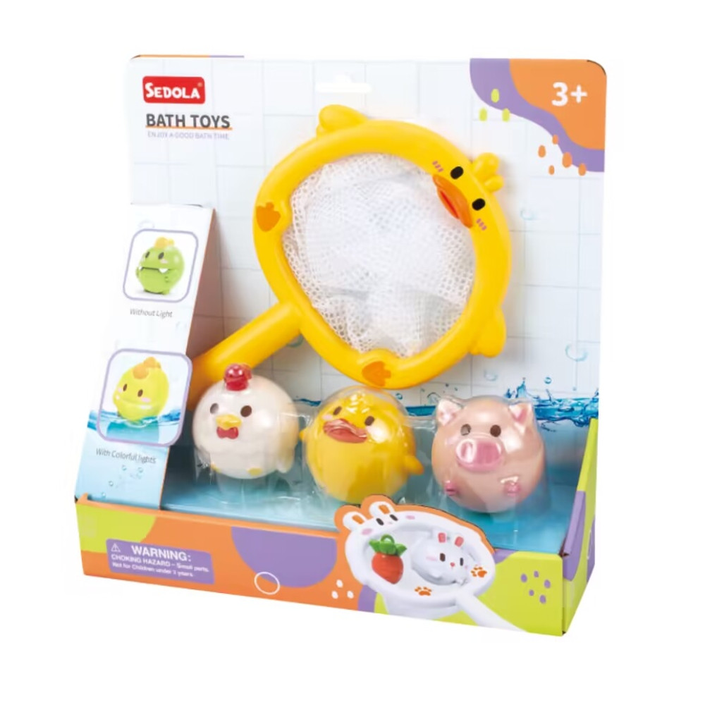 Hračky na potápanie + podberák FarmaPotápačský set s kačičkou, kuriatkom a prasiatkomHračky na potápanie a podberák Farma premenia každé kúpanie na veselú hru so zvieratkami z farmy. V sete nájdete farebný plastový podberák v tvare kačičky a tri plávajúce hračky – kuriatko, kačičku a prasiatko – ideálne na chytanie, potápanie a vymýšľanie vlastných príbehov vo vani alebo bazéne. Mäkký, príjemný materiál hračiek je šetrný k detským rúčkam a ľahko sa udržiava čistý. Deti si pri hre prirodzene rozvíjajú motoriku, koordináciu oko–ruka aj fantáziu, keď sa snažia zvieratká pod vodou nájsť a chytiť do sieťky. Set je vhodný pre deti od 3 rokov a skvele sa hodí ako darček pre všetkých malých milovníkov vody a zvieratiek.