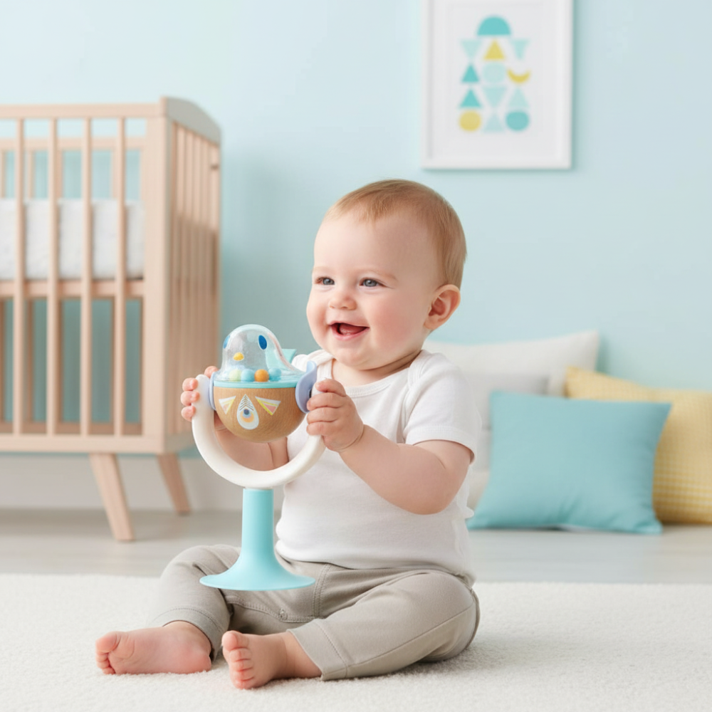 Hrkálka s prísavkou Vtáčik drží vďaka prísavke na hladkom povrchu (stôl, pultík na stoličke). Dieťa ju môže tlačiť, roztáčať alebo rozkývať a objavovať zvuky aj pohyb.Rýchly prehľad výhoda: prísavka – hračka zostane na mieste odporúčaný vek: od 3 mesiacov rozvíja: koordináciu, zmyslové vnímanie, úchop motív: vtáčikAko sa používa Pritlač prísavku na hladký povrch. Nechaj dieťa hračku rozkývať alebo roztočiť. Po hre prísavku uvoľni jemným nadvihnutím.