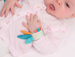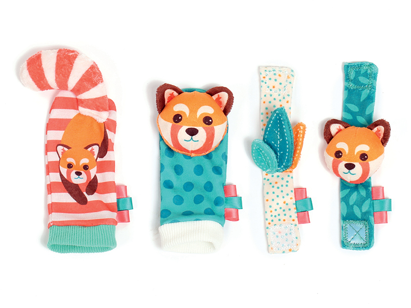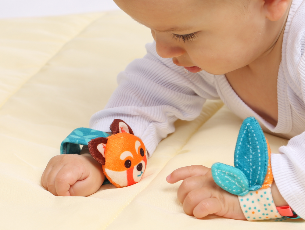 Hrkálky s veselými tvárami pandy podnecujú rozvoj sluchu, zraku a hmatu dieťaťa. Hrkálky sa ľahko pripevnia s pomocou suchého zipsu dieťaťu na zápästie a navlečú na nožičky. Dieťa sa otáča za zvukom a sleduje výrazné farby hračky. Rôznorodé textúry na skúmanie pomáhajú rozvoju hmatu.
