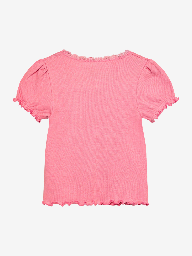 Roztomilé tričko od značky HUTTEliHUT. Okrúhly výstrih je zakončený volánikovým lemom a okraje rukávov aj spodný lem sú upravené baby lock stehom, ktorý dodáva tričku veľmi ženský vzhľad. Tento výrobok obsahuje vlákna TENCEL™. TENCEL™ je ochranná známka spoločnosti Lenzing AG.