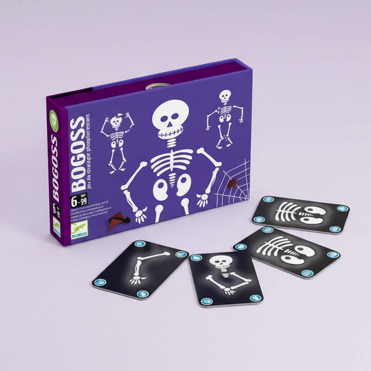 Bogoss je svižná strategická kartová hra s fosforeskujúcimi kartami, takže sa dá hrať aj potme – ideálna na „strašidelné“ večery.Hráči sa snažia poskladať kostru z 6 častí tým, že si od súperov vypytujú konkrétne karty (podobne ako pri kvartete).Pozor však na zvrat: kosti môžu byť celé alebo zlomené.Vyhráva ten, kto ako prvý zloží 2 kompletné kostry z celých kostí alebo 1 kompletnú kostru zo zlomených kostí.Rýchly prehľad odporúčaný vek: 6 – 99 rokov počet hráčov: 2 – 4 doba hry: cca 15 min rozvíja: taktiku, pamäť, sústredenie, rýchle rozhodovanie v balení: 44 fosforeskujúcich kariet, pravidlá Prečo si ju deti zamilujú svieti v tme – hra má skvelú atmosféru jednoduché pravidlá, ale veľa taktiky – koho sa opýtať a kedy riskovať napínavé zvraty so „zlomenými kosťami“ krátke kolá – ideálne na doma aj na cesty Ako to funguje Každý hráč dostane 6 kariet, zvyšok tvorí dobierací balíček. Najmladší hráč začne a opýta sa ľubovoľného hráča na konkrétnu časť kostry, ktorú potrebuje. Ak ju súper má, musí ju odovzdať. Ak ju nemá, berieš si 1 kartu z balíčka. Kedykoľvek poskladáš kompletnú kostru, odlož ju k sebe ako získaný set. Vyhráš, keď máš 2 celé kostry alebo 1 kostru zo zlomených kostí.Obsah balenia 44× fosforeskujúca karta (kosti „celé“ a „zlomené“ + žolíky) 1× pravidlá hryTechnické parametre typ hry: strategická kartová hra (zbieranie setov, vypytovanie) počet hráčov: 2 – 4 čas hrania: cca 15 min počet kariet: 44