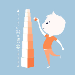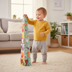 10 krásnych farebných ilustrovaných kociek, ktoré sú vyrobené z veľmi kvalitného, pevného a vysoko odolného vytvrdeného kartónu pre najmenších s nádhernými farebnými obrázkami.Stavanie rozvíja koncentráciu a jemnú motoriku. Kocky sú veľmi pevné a ľahké. Na každej strane kocky je iný obrázok. Deti sa môžu kochať obrázkami samostatných zvieratiek, zvieratkami s mláďatkom, stromčekom, ktorý plynule prechádza kockami a očíslovanými obrázkami ovocia, zeleniny alebo kvietkov, ktoré pomáhajú s prvým počítaním.Výška veže: 87 cmNajväčšia kocka: 15 x 15 x 15 cm
