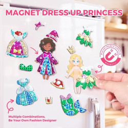 Kreatívna sada Fairy World od Jarmelo využíva obľúbenú techniku peel-and-stick fóliového umenia — dieťa odlepí ochrannú fóliu z lepivej plochy, priloží farebnú fóliu a drevenou tyčinkou ju pritlačí. Farba sa prenesie na obrázok, zvyšok sa odlepí a vznikne trblietavý detail bez lepidla a farieb. Sada kombinuje tri aktivity v jednom balení — nálepkové obrázky na canvas podložkách, 3D penové puzzle, ktoré sa skladá do priestorových postavičiek víl, a magnetické obliekanie, ktoré sa dá nalepiť aj na chladničku a použiť na opakovanú hru. Výsledné víly sa dajú vystaviť v izbe alebo ďalej použiť ako magnetické figúrky.