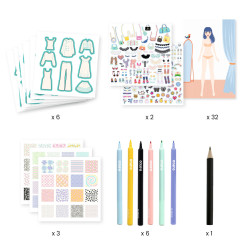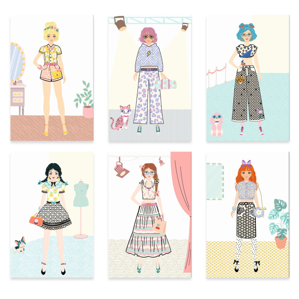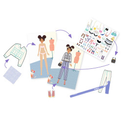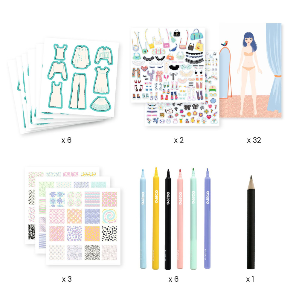 Kreatívna sada Navrhni si módnu kolekciu Trendy Kreatívna módna tvorba pre malé návrhárkyKreatívna sada Navrhni si módnu kolekciu Trendy od značky Djeco je nápaditá výtvarná sada pre deti, ktoré baví móda, kreslenie a navrhovanie vlastného štýlu. Dieťa si vyberie kartu so siluetou postavy a pomocou pripravených šablón oblečenia obkresľuje, kombinuje a dotvára jednotlivé modely. Výsledné návrhy môže následne vyfarbiť, doplniť vzormi a ozdobiť metalickými samolepkami, takže každá módna kolekcia pôsobí originálne a prepracovane.Djeco ponúka tvorivú aktivitu, pri ktorej si deti rozvíjajú fantáziu, cit pre farby aj zmysel pre detail. V sade sa nachádza 32 kariet so siluetami, 6 listov s predvystrihnutým oblečením, 3 listy farebných vzorov, 2 hárky zlatých metalických samolepiek, 6 fixiek s dvojitým hrotom a ilustrovaný návod krok za krokom. Vďaka tomu si dieťa môže vytvárať množstvo vlastných módnych kombinácií bez potreby ďalších pomôcok.Prečo si deti túto kreatívnu sadu obľúbia Navrhovanie vlastných outfitov podporuje tvorivosť a fantáziu Šablóny oblečenia uľahčujú kreslenie a pomáhajú s prvými módnymi návrhmi Metalické samolepky a farebné vzory dodávajú návrhom výrazný štýl 32 siluetových kariet ponúka veľa možností na nové kombinácie Fixky v balení umožnia začať tvoriť hneď po otvorení sadyTvorenie, ktoré rozvíja cit pre detailTáto kreatívna sada pre deti je vhodná pre všetkých, ktorí radi kreslia, zdobia a vymýšľajú vlastné módne kombinácie. Pri práci so sadou si deti precvičujú jemnú motoriku, koncentráciu, vizuálne vnímanie aj schopnosť skladať farby a vzory do harmonického celku. Výtvarná aktivita zároveň podporuje samostatné rozhodovanie a prináša priestor na vlastný štýl a sebavyjadrenie. Podľa dostupných predajcov je sada určená pre deti približne od 6 rokov.