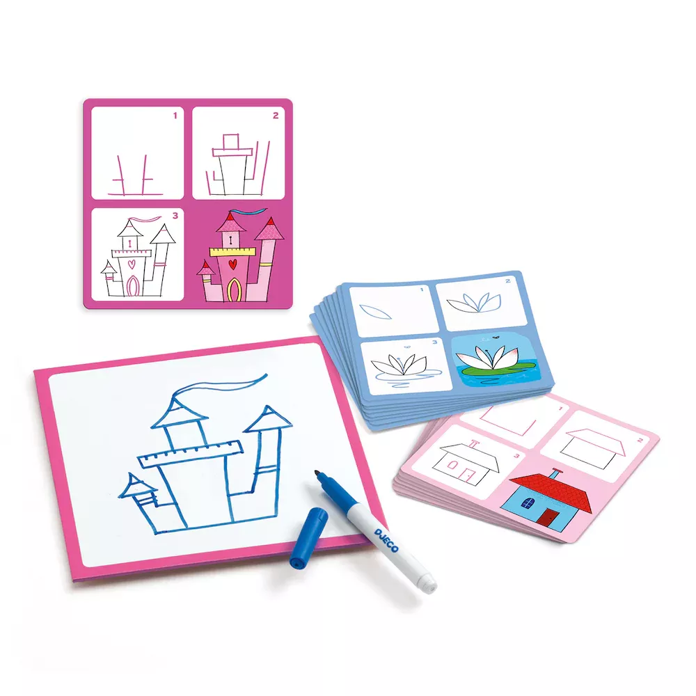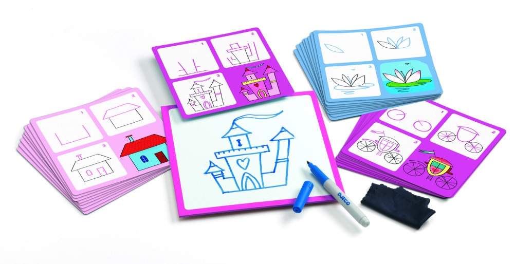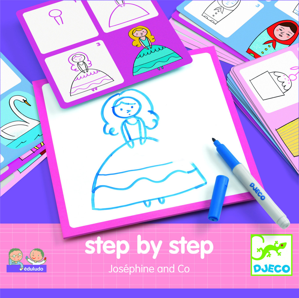 Krok za krokom – Princezné je zábavná edukačná sada z kolekcie Eduludo, ktorá deti učí kresliť princezné, kvety a ďalšie dievčenské motívy jednoduchým a zrozumiteľným spôsobom. Vďaka názorným predlohám sa dieťa učí kresliť krok za krokom, bez stresu a s radosťou z každého podareného obrázka. Kreslenie sa tak prirodzene mení na hru, ktorá rozvíja trpezlivosť, sústredenie a sebavedomie. Dieťa kreslí stierateľnou fixkou na tabuľku podľa predlohových kariet a hotový obrázok môže jednoducho zotrieť a skúšať znova, čo podporuje učenie bez obáv z chýb.
