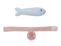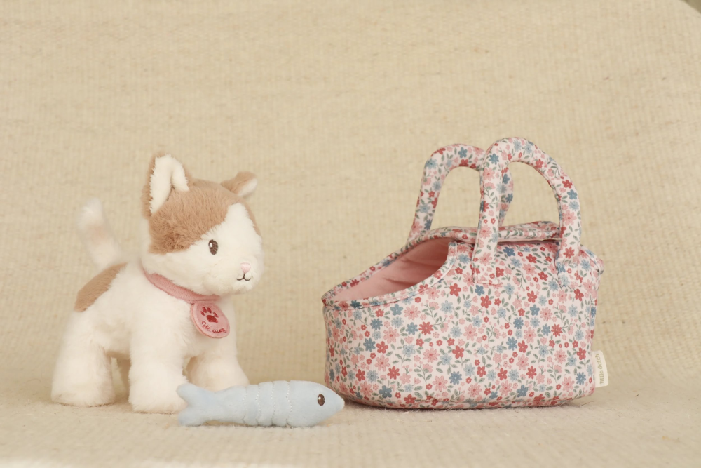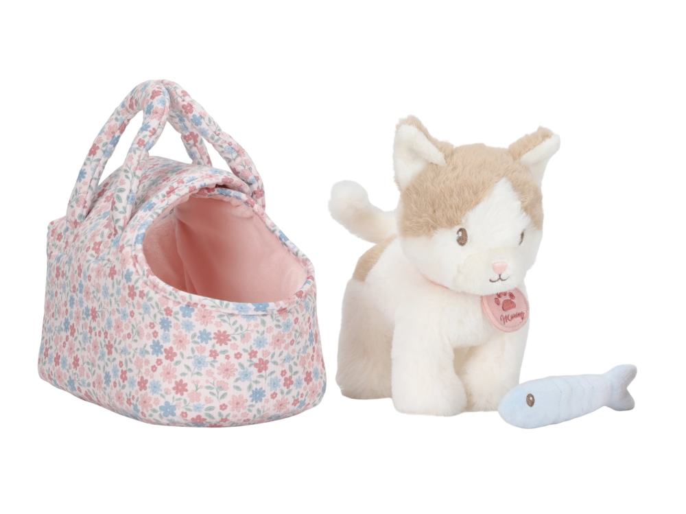 Mačička prichádza v elegantnej kvetovanej taške s predným otvorom, aby mohla zvedavo vykukovať von. Vďaka tomu si ju deti môžu vziať kamkoľvek – na prechádzku, na výlet, do škôlky alebo napríklad k starým rodičom. Na krku má prívesok so svojim menom. Plyšová rybka na hranie má vo vnútri magnet, takže drží mačičke pri papuľke.