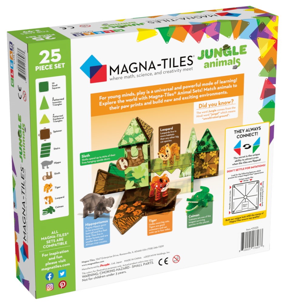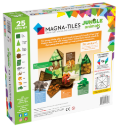 Úžasná magnetická stavebnica Magna-Tiles® Jungle prináša hodiny nápaditej a sústredenej zábavy. Obsahuje päť magnetických zvieratiek z džungle (hroch, leňochod, tiger, leopard a aligátor) s pohyblivými časťami, ktoré sú pripravené preskúmať divoký prales. Deti sa navyše naučia fakty o zvieratkách, ktoré v tomto záhadnom svete žijú. Všetky diely sú plne kompatibilné a dopĺňajú sa so všetkými ostatnými súpravami Magna-Tiles.