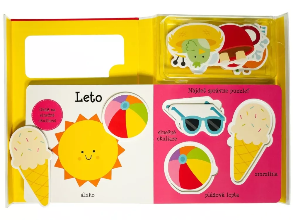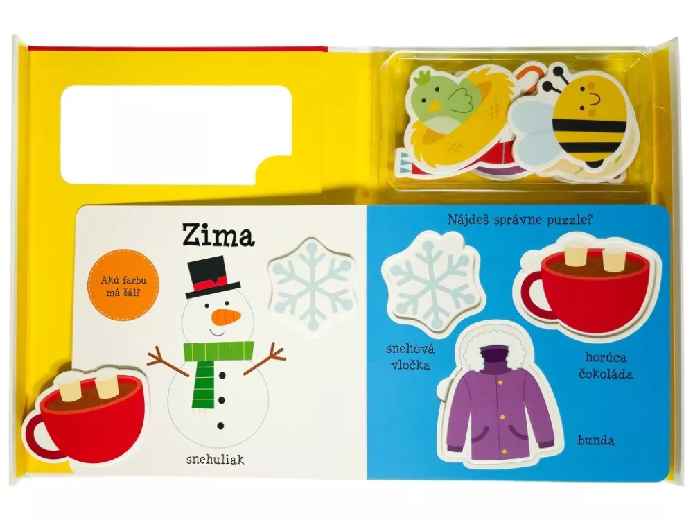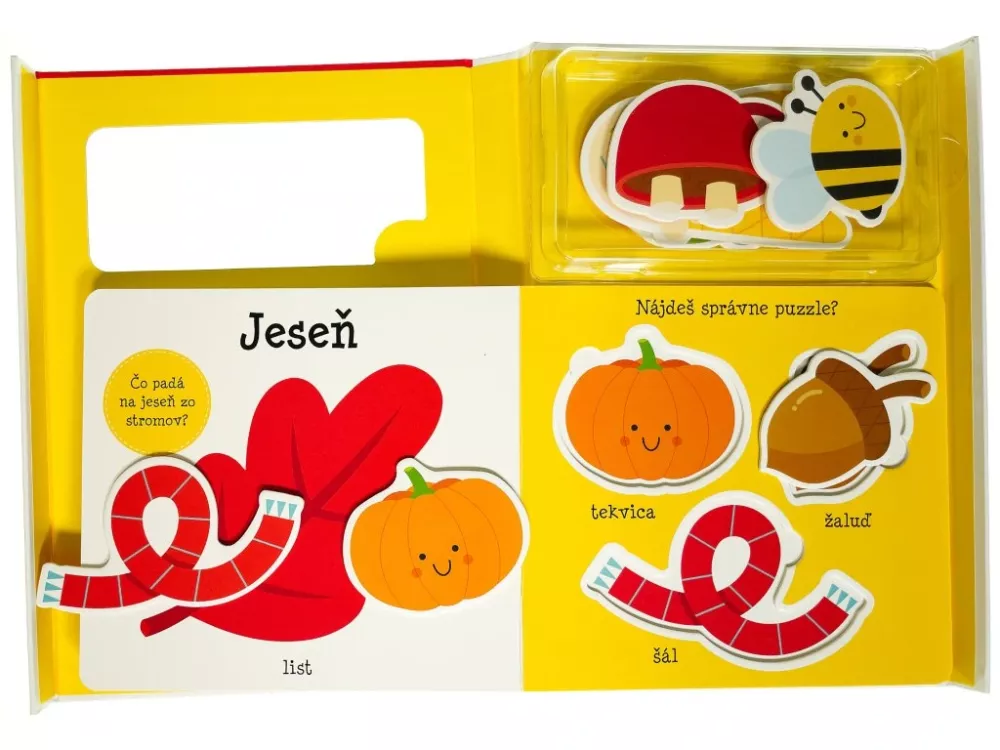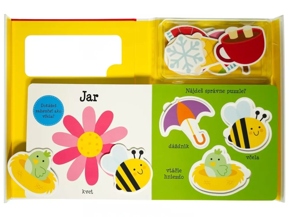 Praktická kazeta s knižkou z pevného materiálu obsahuje 12 dielikov puzzle, na ktorých si deti potrénujú motoriku a zoznámia sa s ročnými obdobiami.