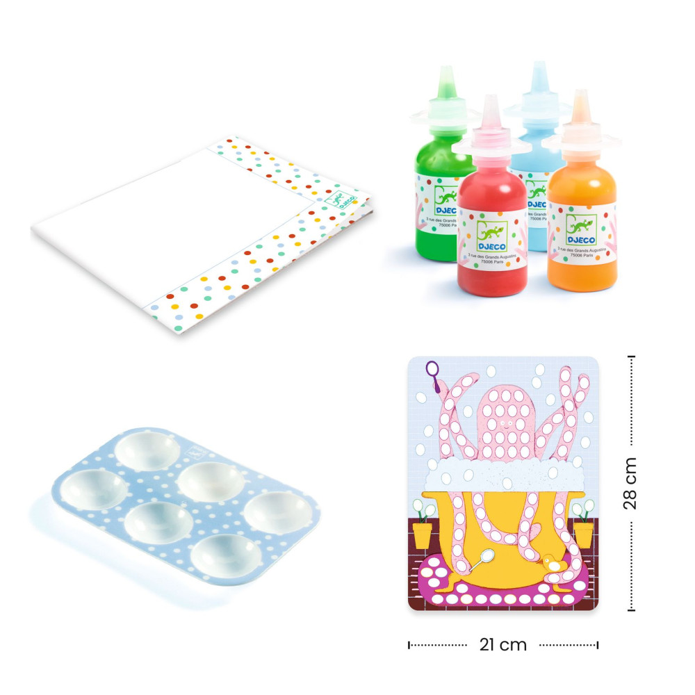 Maľovanie prstami Bodky a rybičky Prvé maľovanie prstami s rybičkamiMaľovanie prstami Bodky a rybičky od značky Djeco je veselá výtvarná sada pre malé deti, ktoré rady tvoria rukami a objavujú farby hravou formou. Dieťa nanáša prstové farby priamo prstami na vyznačené miesta v obrázku a postupne tak dotvára farebné rybičky a podmorskú scénu. Táto aktivita je vhodná ako prvý krok k maľovaniu, pretože je jednoduchá, zábavná a prináša rýchly viditeľný výsledok.Ako tvorenie fungujeV sade sa nachádzajú 4 veľké obrázkové podklady, na ktorých sú vyznačené prázdne miesta určené na doplnenie farebnými odtlačkami. Dieťa si vyberie farbu, nanesie ju prstom na správne miesto a obrázok sa postupne zaplní bodkami. Maľovanie prstami je pre deti prirodzené a zároveň podporuje radosť z farieb, kontakt s materiálom a voľné tvorivé objavovanie.Čo nájdete v balení 4 veľké obrázky s rozmerom približne 21 × 28 cm 4 kelímky prstových farieb 1 paletu 1 návod s postupom tvoreniaPrečo je táto sada dobrá voľba vhodná ako prvé maľovanie prstami pomáha rozvíjať jemnú motoriku a koordináciu oko ruka podporuje vnímanie farieb a tvorivú sebadôveru prináša zmyslový a výtvarný zážitok v jednom veľké podklady sú praktické pre malé detské rukyTvorivá aktivita pre malé detiDjeco Maľovanie prstami Bodky a rybičky je pekný tip na kreatívny darček pre deti, ktoré sa zoznamujú s prvými výtvarnými aktivitami. Vďaka jednoduchému princípu, veľkým obrázkom a priamemu kontaktu s farbou je sada vhodná na pokojné domáce tvorenie aj spoločné chvíle s rodičmi. Hotové obrázky deti motivujú pokračovať a skúšať ďalšie farby aj kombinácie.
