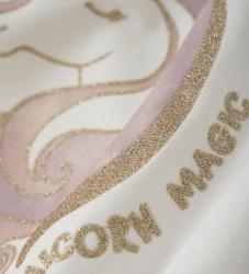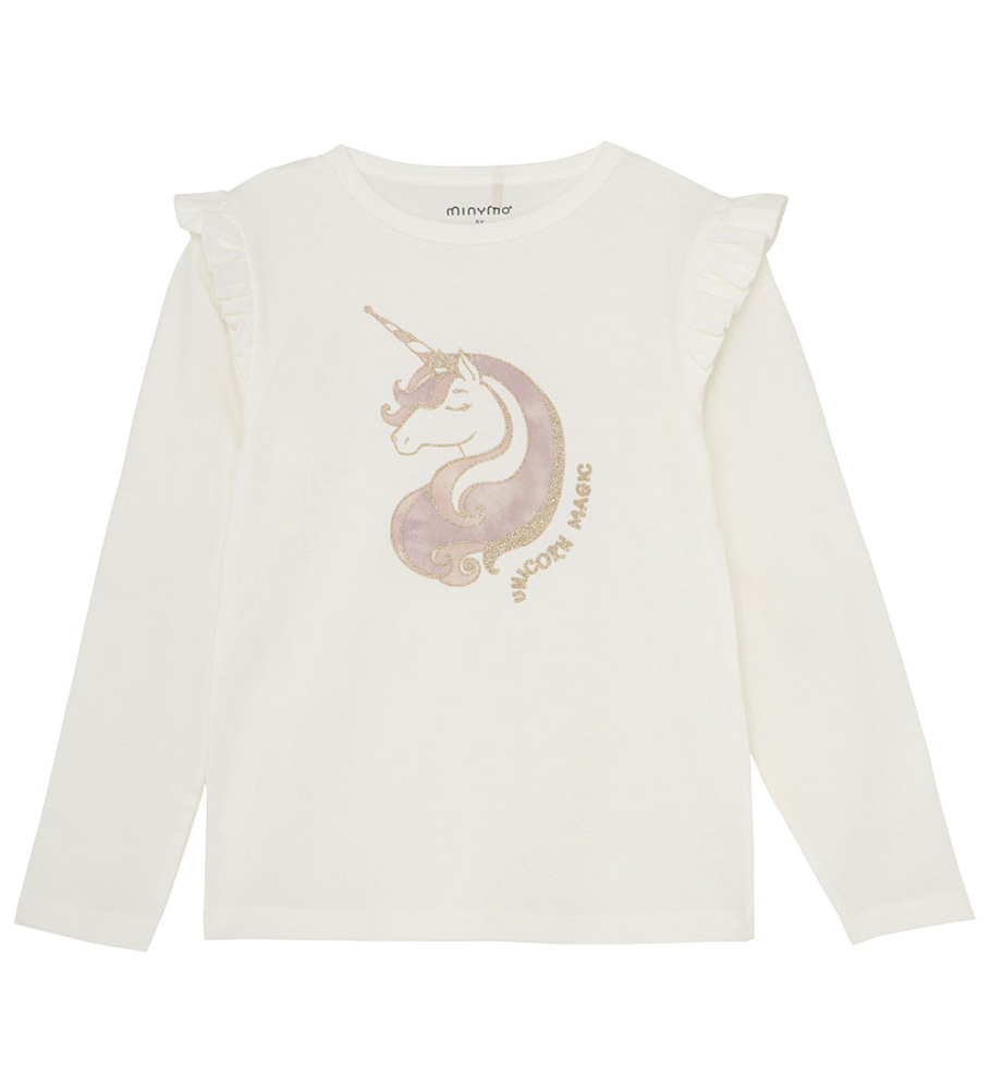Krásna blúzka Minymo s dlhými rukávmi v bielom odtieni s jemnými volánikmi na ramenách. Blúzka je zdobená potlačou jednorožca a nápisom „Unicorn Magic“ na prednej strane so zlatými trblietkami, ktoré dodávajú hravý nádych šatníku vášho dieťaťa.