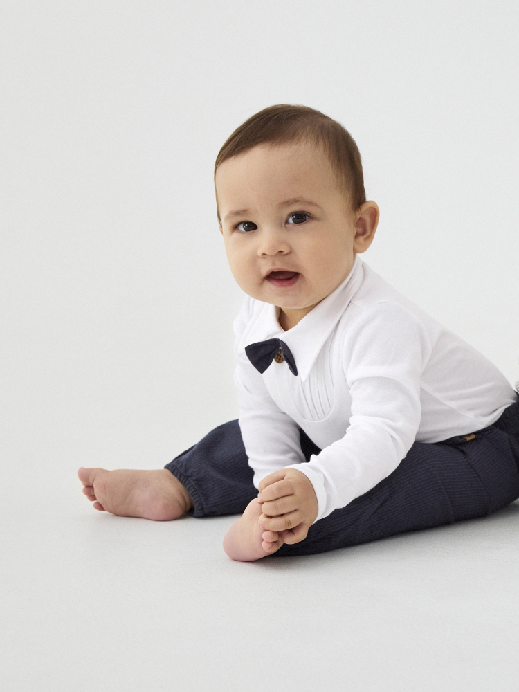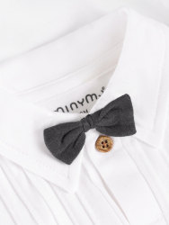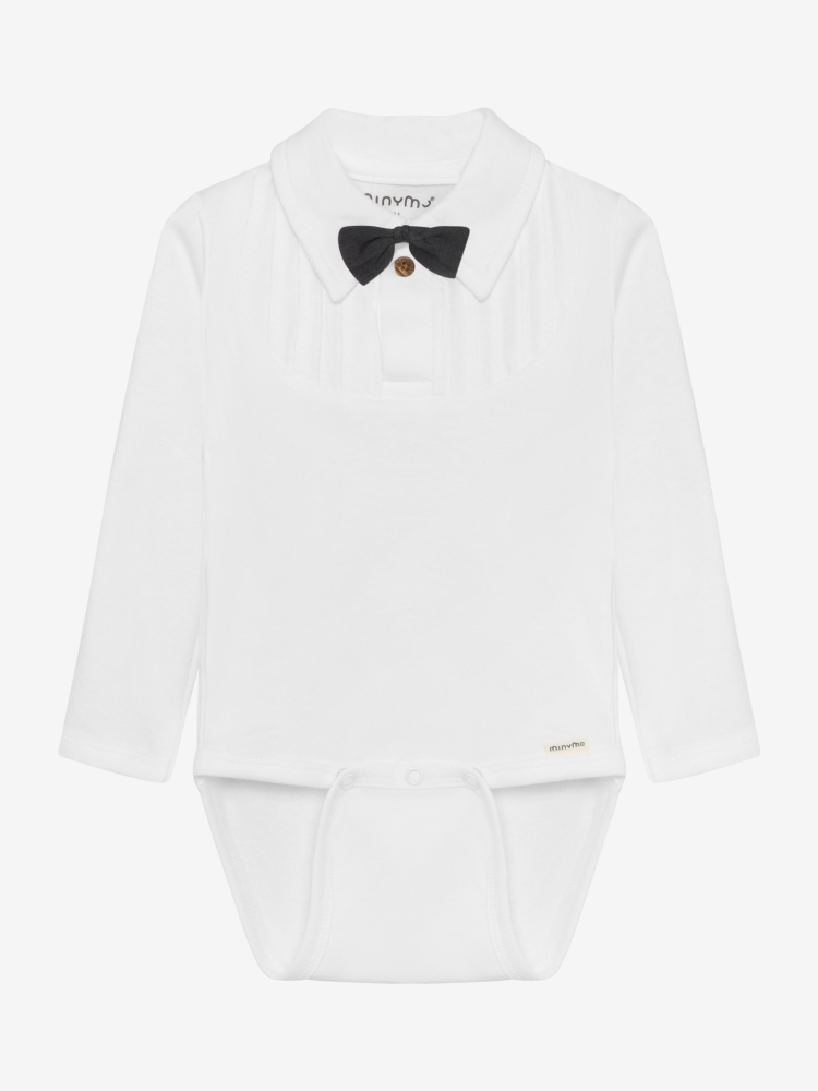 Body s motýlikom od Minymo. Body je jednofarebné s golierom, gombíkmi na vrchu a našitým motýlikom. Zapína sa patentkami medzi nohami. Vyrobené zo 100 % certifikovanej organickej bavlny. Certifikované podľa GOTS - organické CERES-0366.