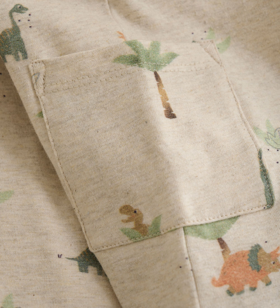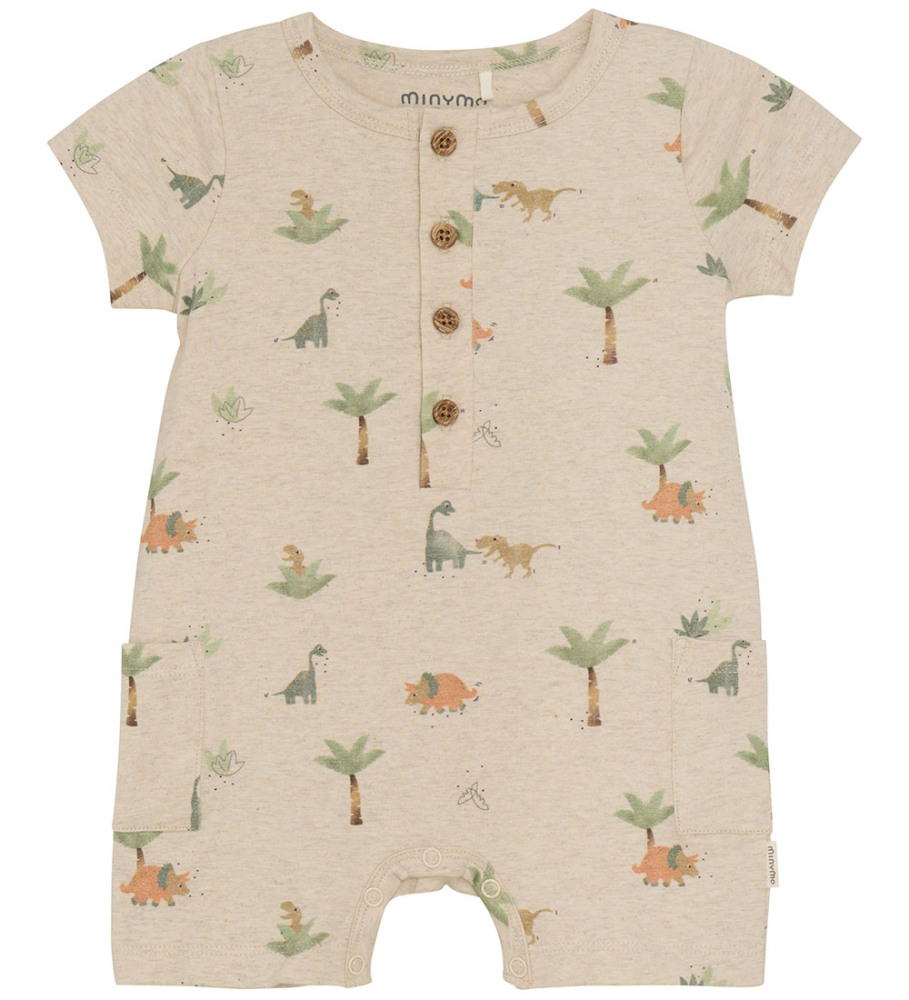 Praktický letný overal Minymo vo svetlobéžovej farbe zdobený roztomilou celoplošnou potlačou dinosaurov, listov a paliem.