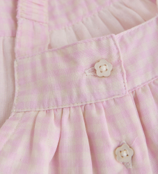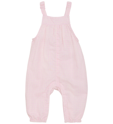 Elegantné overaly Minymo v svetloružovom odtieni s kockovaným vzorom. Overal Minymo má elastické ramienka a dlhé nohavice s elastickými okrajmi. Overal sa dá vzadu rozopnúť pomocou gombíkov v tvare kvetu a medzi nohavicami praktickými patentnými gombíkmi.