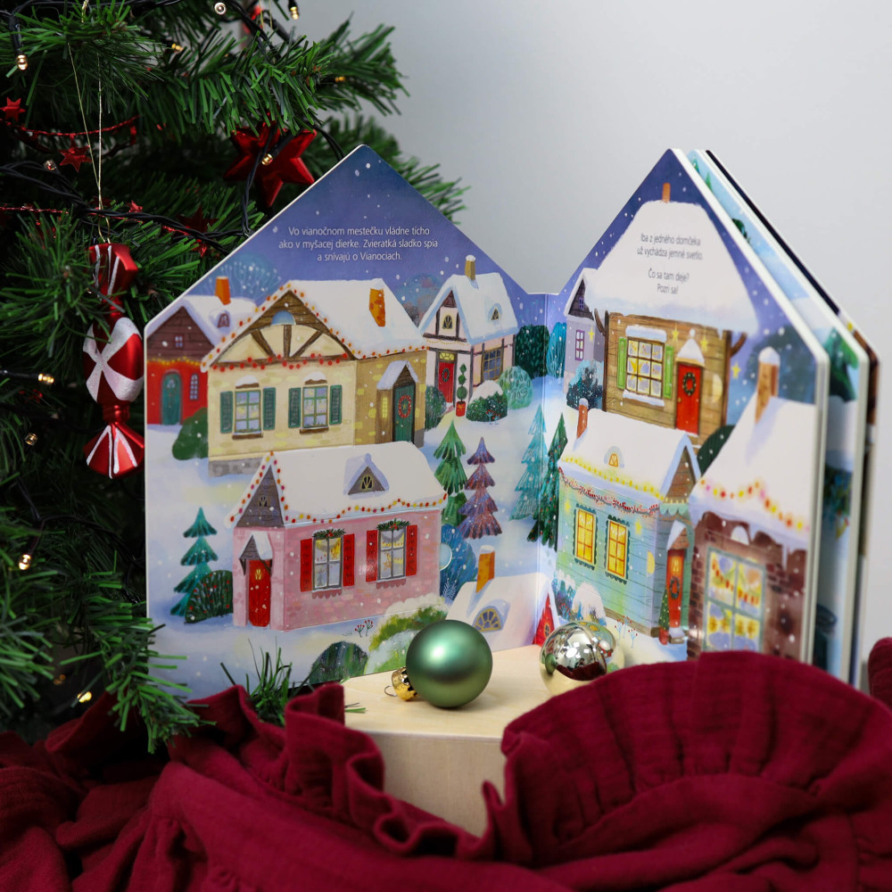 Nakukni do zvieracieho vianočného mestečka! Vianočné prípravy sú v plnom prúde. Ako to tam vyzerá? Každá rodina má svoje zvyky a tradície. Čo zvykne raňajkovať myšacia rodinka na Vianoce? Čím zdobia malé zajačiky svoj vianočný stromček? A kto tak krásne pestrofarebne balí všetky darčeky? Čo sa deje na vianočnom trhu a u koho nájdeš ten najlepší vianočný punč? Nech sa páči, presvedč sa sám: tu smieš pootvárať všetky dvere i okná.