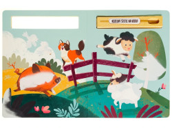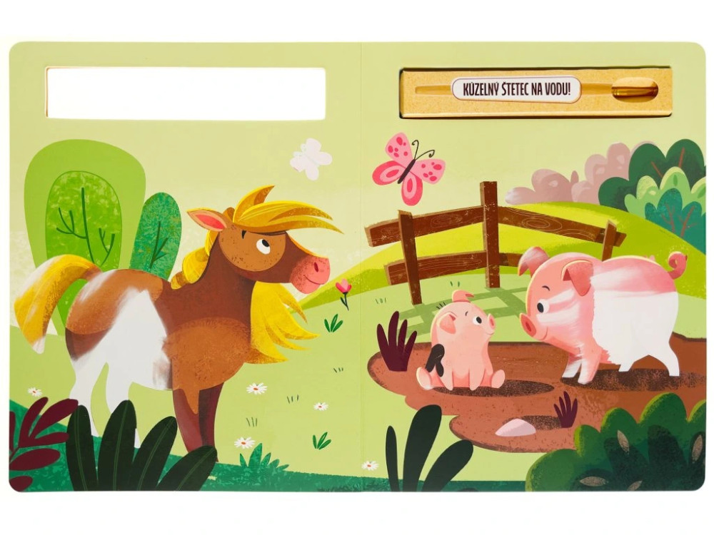 Pretri štetcom biele miesta v tejto knihe určenej na maľovanie vodou. Obrázky zvierat z farmy sa ako kúzlom objavia a po uschnutí farby zasa zmiznú.