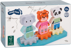 Tri milé džungľové zvieratká – slon, tiger a panda – pozostávajú z troch stohovateľných prvkov, ktoré deti musia nasadiť na ozubené koliesko v správnom poradí. Keď sa otočí jedno koliesko, pohyb sa prenesie na všetky tri figúrky, čo poskytuje fascinujúci efekt príčiny a následku.