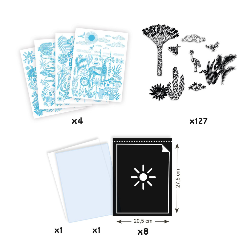 Kreatívna sada Noc na savane: Kyanotypová (fotocitlivá) sada od značky Djeco prináša deťom magický zážitok z maľovania svetlom. Tento projekt je založený na fotografickej technike kyanotypii, pri ktorej deti vytvárajú originálne modré obrazy tým, že umiestnia nepriehľadné vzory na fotocitlivý papier a vystavia ho slnečnému svetlu. Po krátkom vystavení slnku sa na papieri objaví negatív, ktorý sa následne zafixuje spláchnutím v čistenej vode – výsledkom sú obrázky s nádherným modrým pozadím, ktoré pripomínajú nočnú savanu.S touto výtvarnou sadou si deti môžu pripraviť:4 umelecké obrazy inšpirované nočnou savanou, každý obrázok vzniká fotografickou technikou kyanotypie, ktorá reaguje na slnečné svetlo.Táto kreatívna aktivita je skvelým spôsobom, ako spoznať mechanizmus fungovania svetla a tieňa, pochopiť starú fotografickú techniku hravou formou a vyrobiť jedinečné umelecké diela, ktoré si deti môžu vystaviť alebo darovať.Obsah balenia- 4 laserom vyrezané rámy, 8 listov fotocitlivého papiera (21 × 28 cm), 127 vzorov tlačených na acetáte, 1 plexisklová doska, ilustrovaný návod krok za krokom. Čo si deti pri tvorení rozvíjajú- kreativitu a umelecké cítenie pri tvorbe originálnych obrazov, pochopenie svetla a tieňa, čo je základ kreatívnej fotografie, trpezlivosť a sústredenie pri práci s postupom krok za krokom, logické a priestorové myslenie pri umiestňovaní vzorov, zmysel pre estetiku a farebné vnímanie pri hotových dielach. Prečo si vybrať túto kreatívnu sadu od Djeco- deti sa učia prostredníctvom zážitku, žiadne komplikované chemikálie – všetko funguje pomocou slnečného svetla a vody, výsledné obrazy sú originálne a jedinečné pre každé dieťa, vhodné pre deti od 7 rokov a staršie aj dospelých, ktorí chcú tvoriť spolu s deťmi, kvalitný materiál s ekologickým FSC® papierom