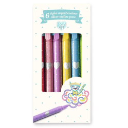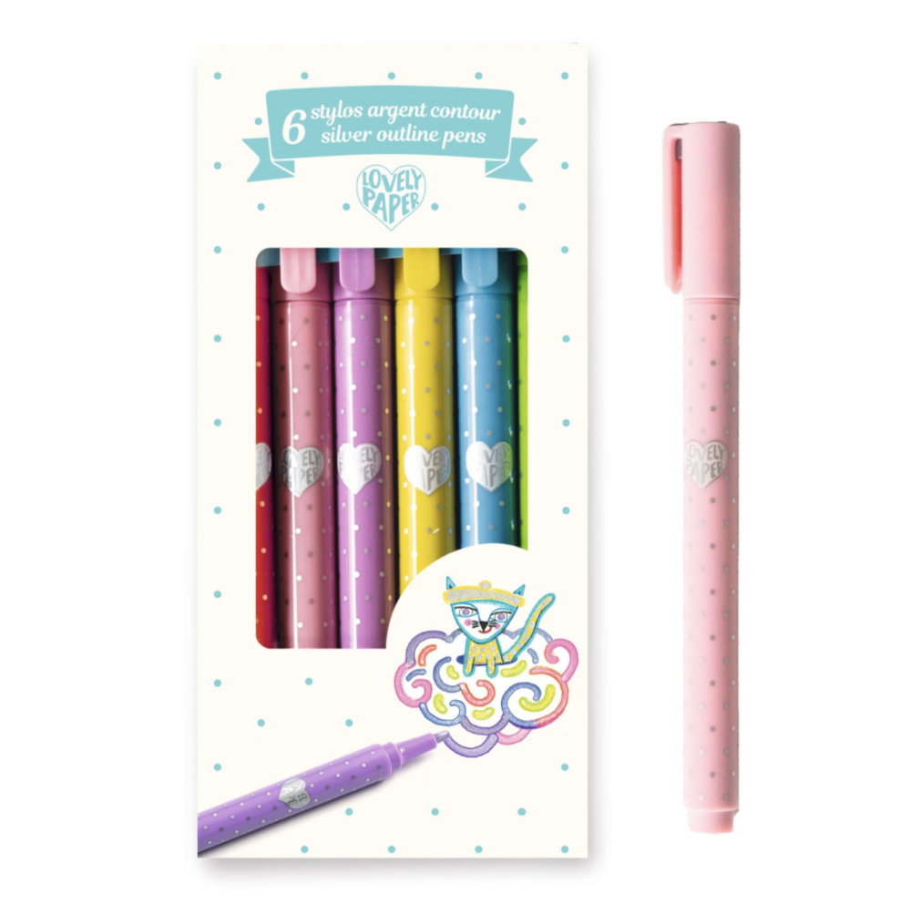 Sada 6 farebných obrysových pier so strieborným leskom z kolekcie Lovely paper. Farby: červená, žltá, zelená, modrá, ružová a fialová. Pre rýchly výber farby majú farebný vrchnák aj s klipsom, aby sa dali pripnúť na zošit. Sú balené v lepenkovom obale s okienkom.